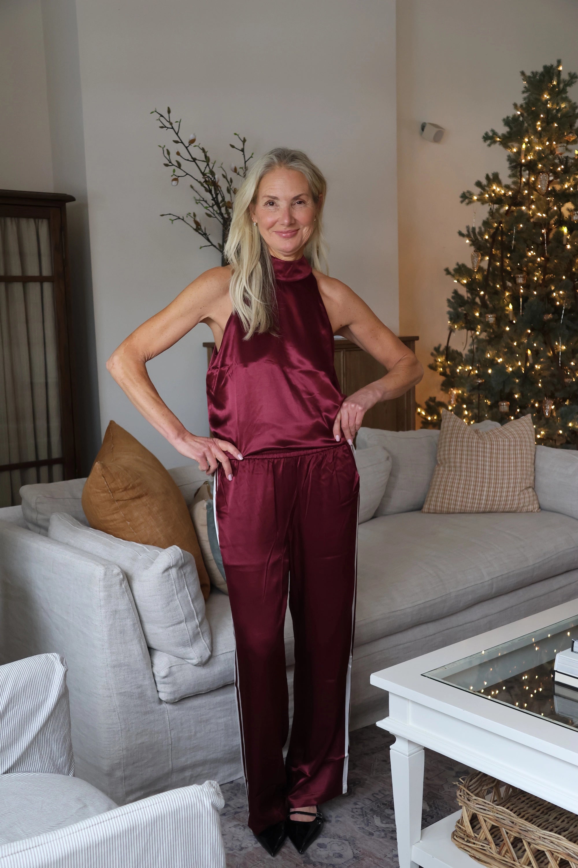 Another matching set we are obsessed with is the Rails Merida Burgundy Classic Track Stripe Pant in crepe with a luxurious satin finish paired together with the Leah Top, a sophisticated halter style flowy top designed with luxe satin crepe. This is a match made in heaven for an effortless, fashion-forward look together and when worn separately, the style formulas increase dramatically.