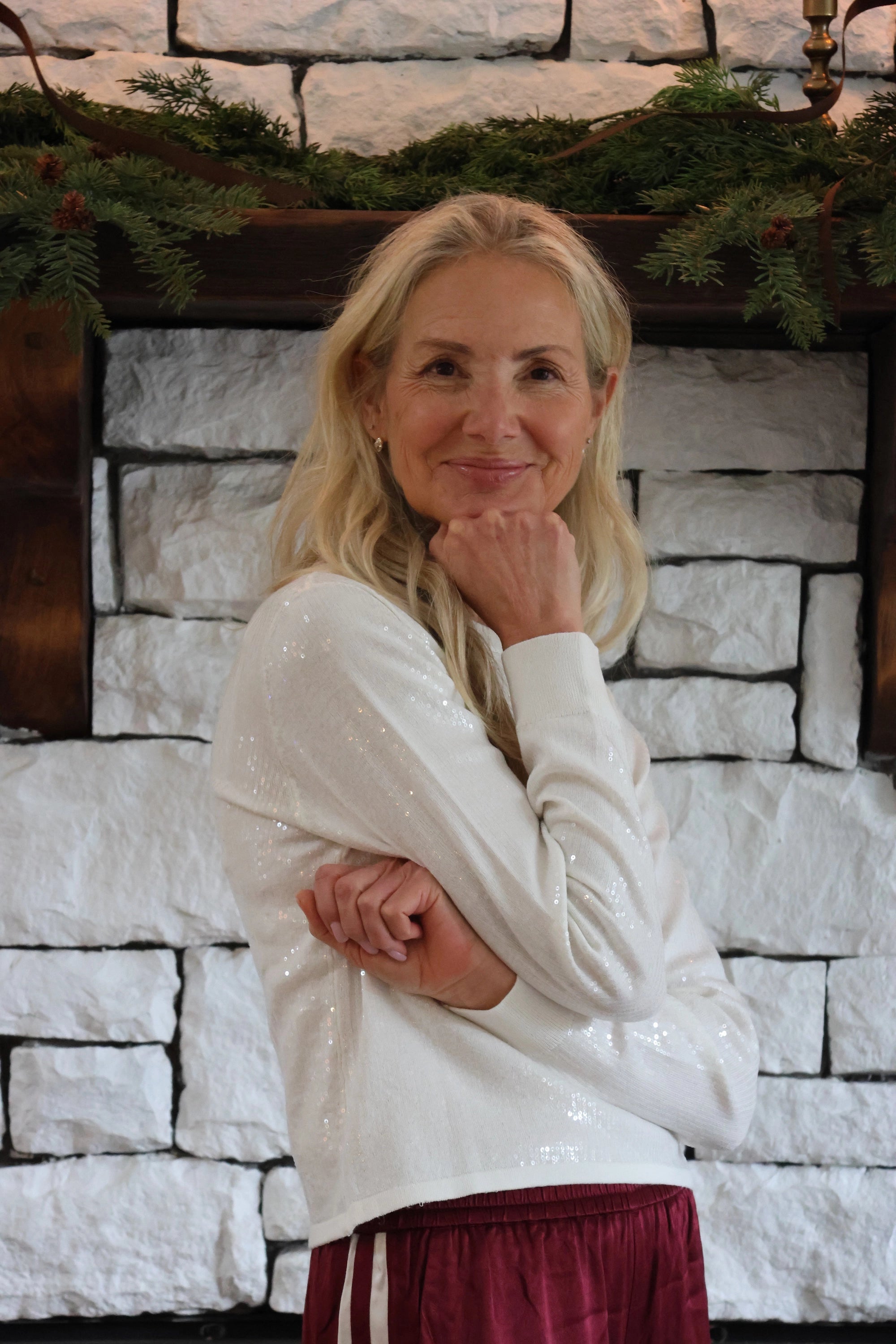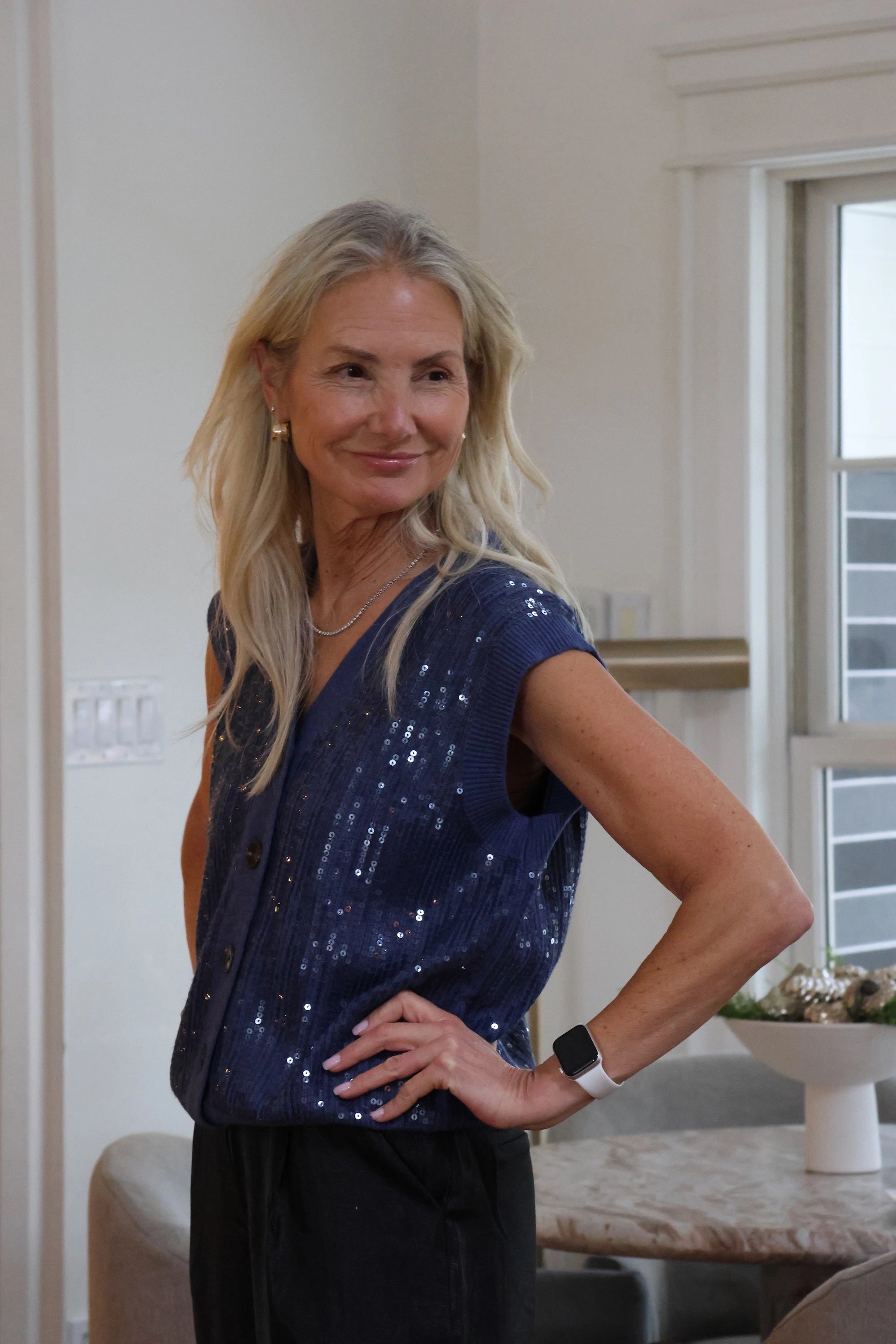 As we head into the holiday season, things that sparkle always catch our eye. This year, the sparkle trend aligns perfectly with our approach to effortless style..it's festive fashion now and wearable well into 2026. We are talking about elevated sparkle: sleek silhouettes, refined palettes and soft metallic tones for a polished look without the flash. The good news is sequins are no longer limited to a few short weeks. We are loving their surprising versatility as they transition seamlessly from everyday casual to nighttime glam. Imagine dark denim with the Holloway Cardigan, a sleeveless vest with tone on tone shimmer, the perfect stylish update for the day. It moves seamlessly from desk to dinner styled with a black wide-leg silhouette pant. The Toby Sequin Pant is another perfect pick for festive cocktails and to wear later in 2026 with a sweatshirt and sneakers for next-level casual chic.