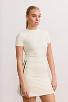 This tennis capsule captures the essence of traditional tennis apparel with modern twists. The innovative and sustainable materials used in the clothing provide a comfortable fit, while showcasing the classic details that make tennis attire unique. It offers a luxurious, body-hugging design with a blend of recycled nylon and spandex, ensuring both support and comfort. Get ready to conquer the court in style with the RIVER LIFT Tennis Skirt.