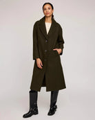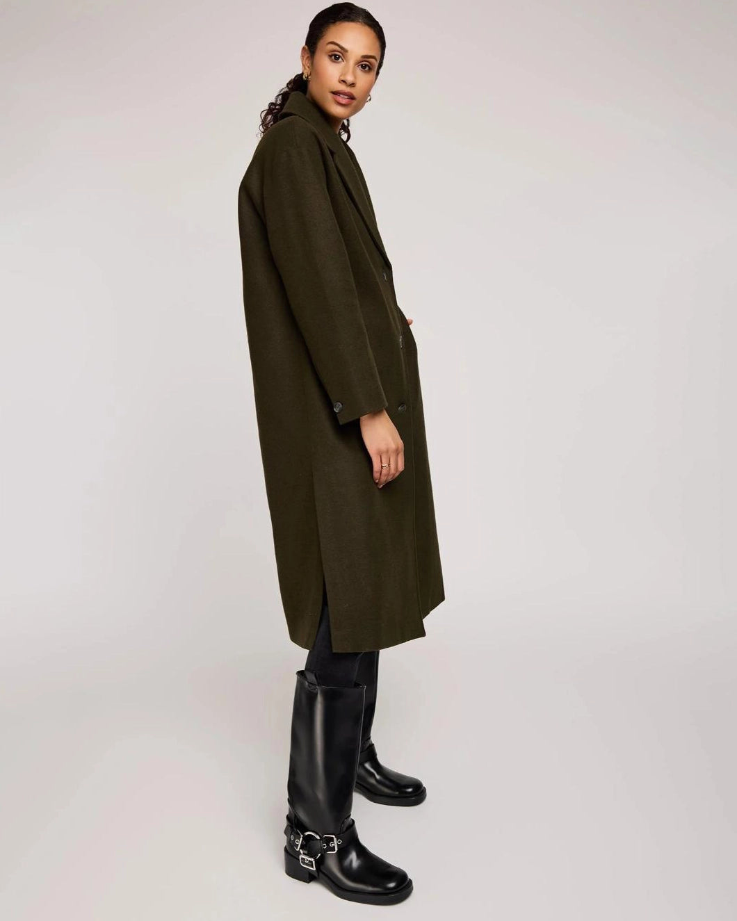 The Agatha coat is made of a soft, brushed melton fabric and is fully lined. Features include a front button closure, welt pockets, and side slits.