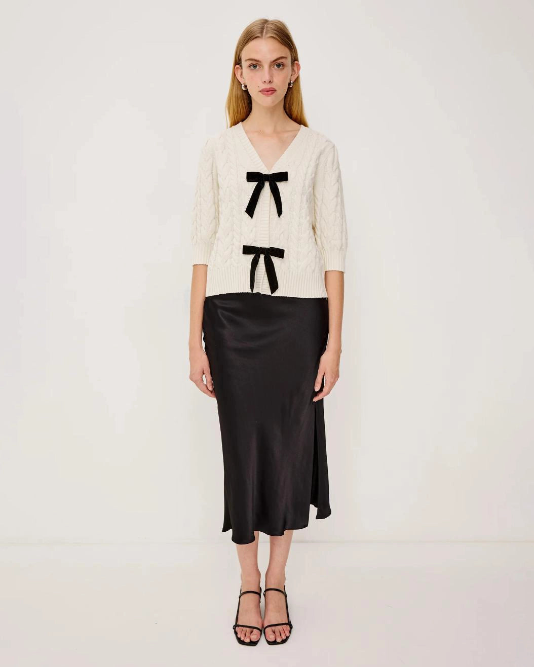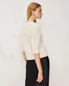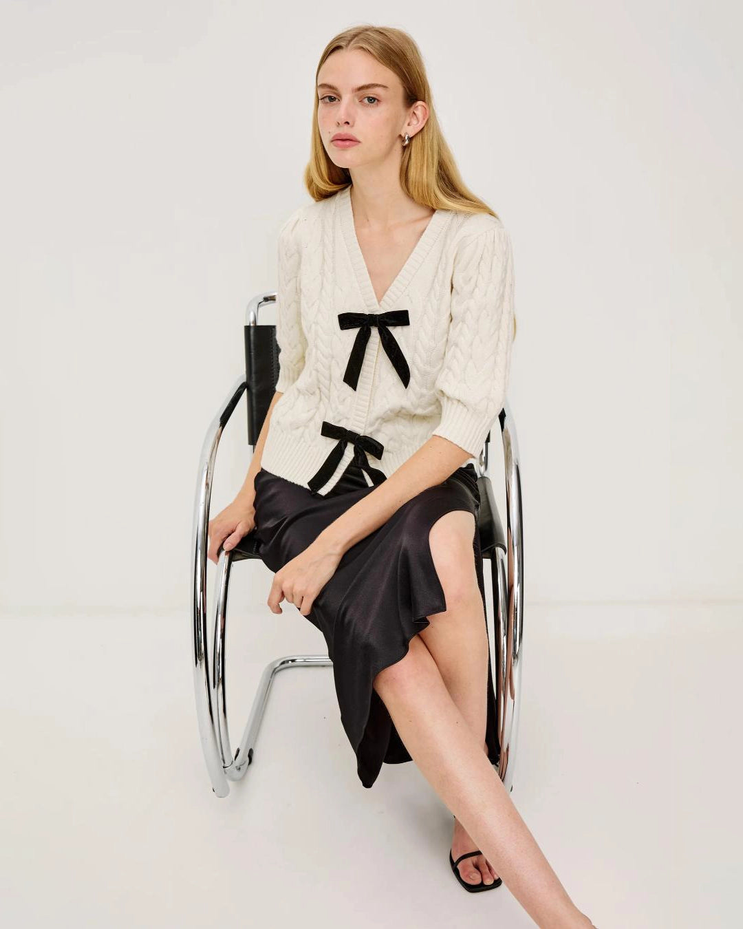 Timeless and romantic, the Clarissa celebrates elegant charm with its contrasting velvet bows. Made from a sumptuously soft cable knit, this relaxed cropped sweater features three-quarter puff sleeves and hidden snap closures at the front.