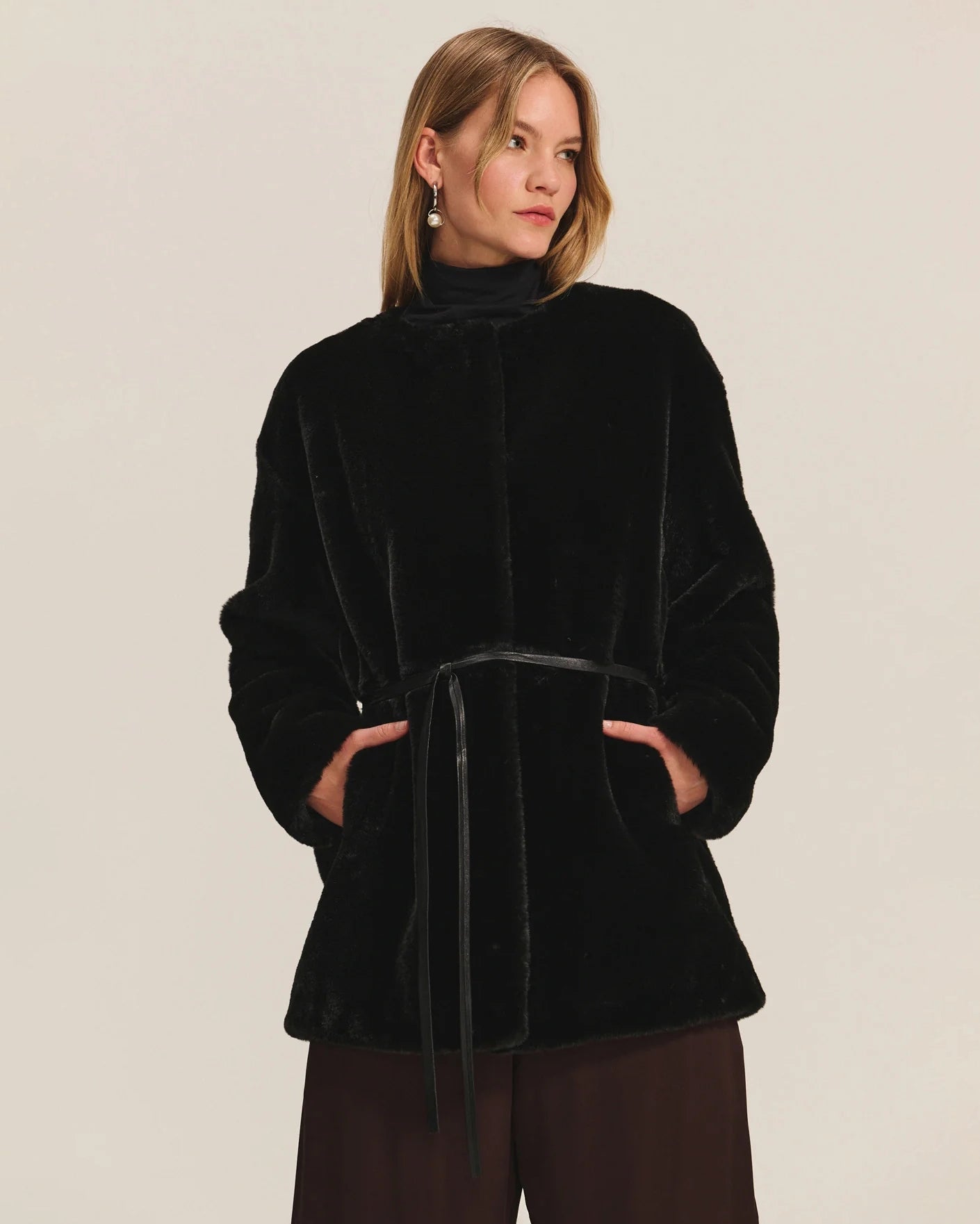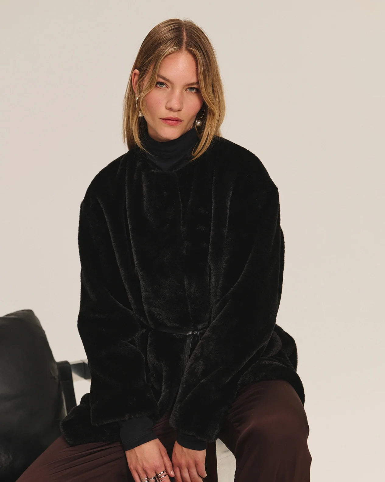 Crafted from luxe faux fur, this jacket offers rich texture and an irresistibly soft feel while bringing warmth and sophistication to any look. Designed with snap button closures, front slash pockets, and a detachable faux leather belt, it delivers a chic, elevated finish that instantly enhances any outfit.
