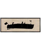 This image features a silhouette of a runabout holding a man and his canine friend. The movement of the flags attached to the boat and the floppy ears of the dog, give this image a sense of energy and motion, while the creased paper texture brings a sense of tactility and charm.