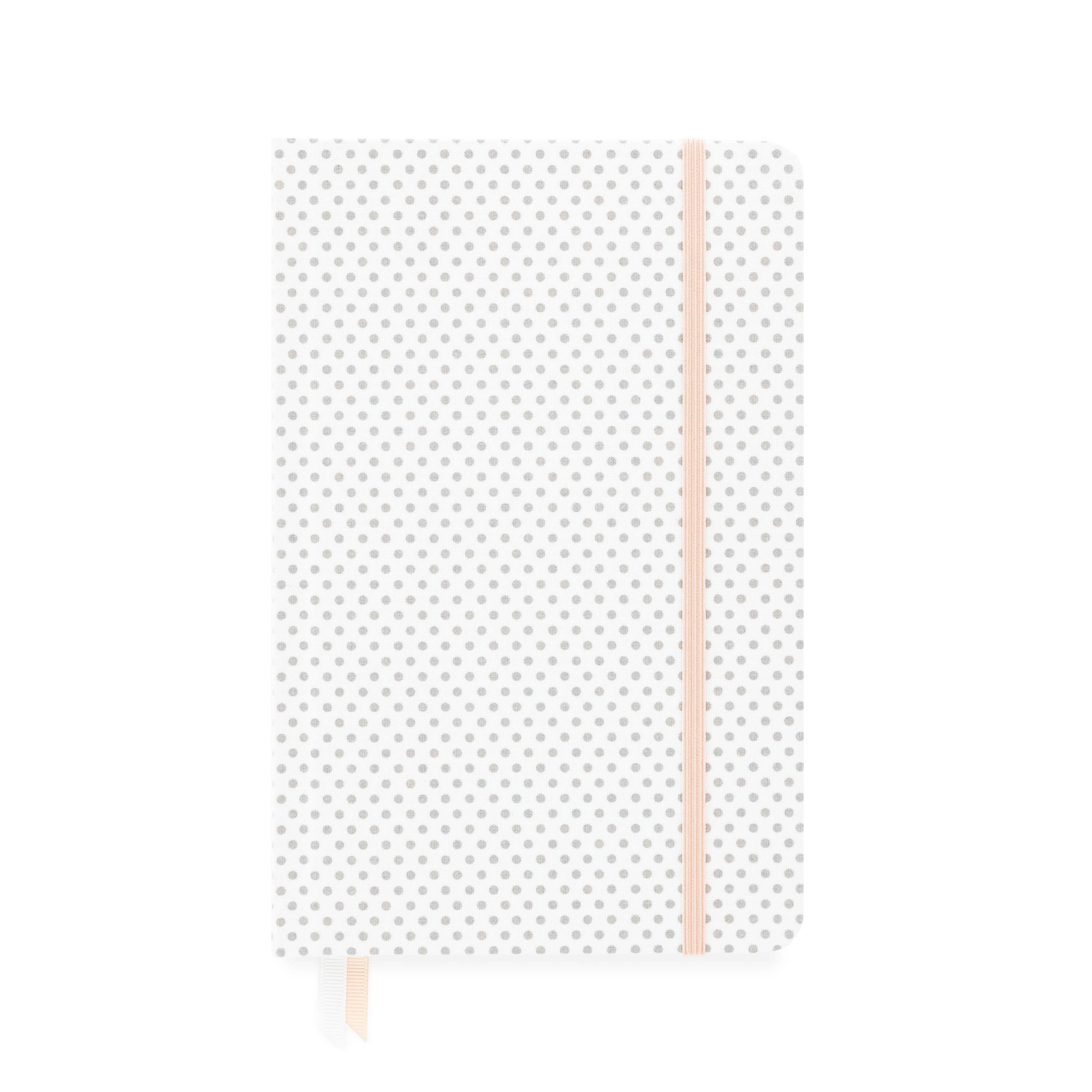 Hardcover with flax and white dot print bookcloth and a pink elastic closure, the journal includes 50 lined pages and double grosgrain ribbons to help you keep your place.