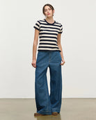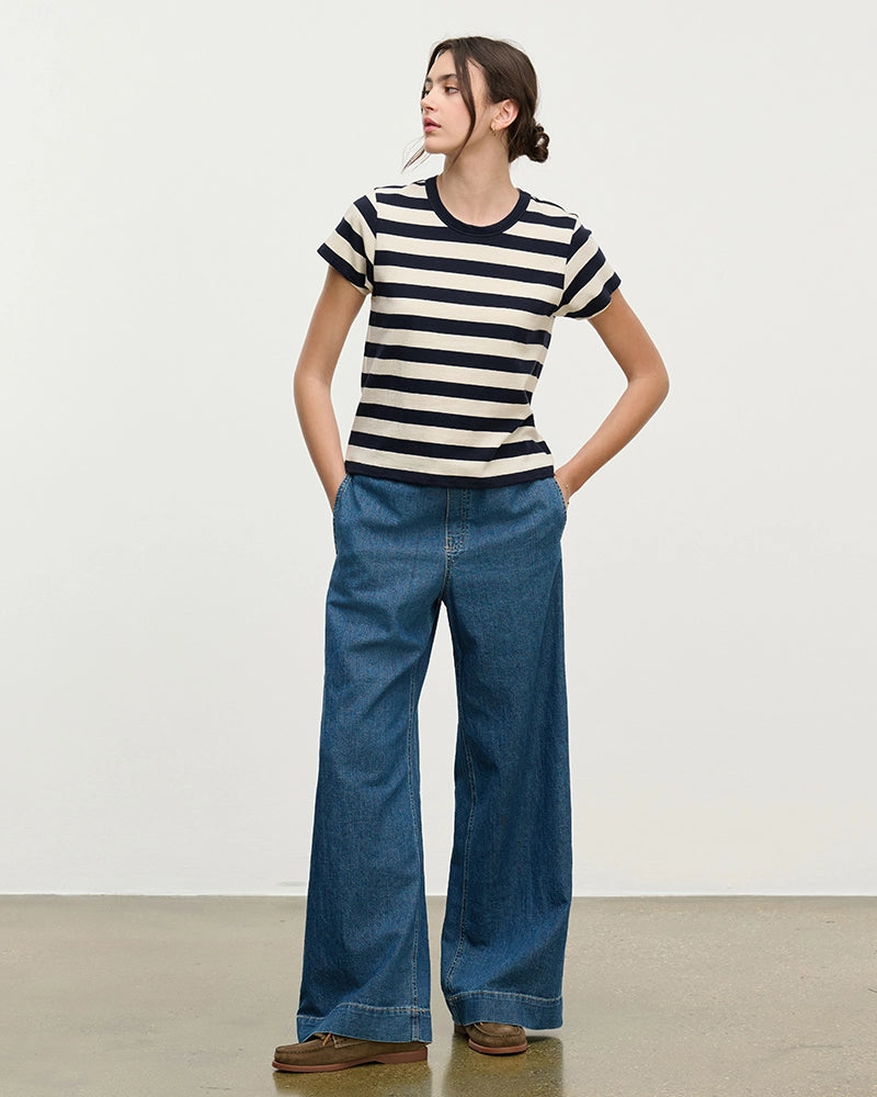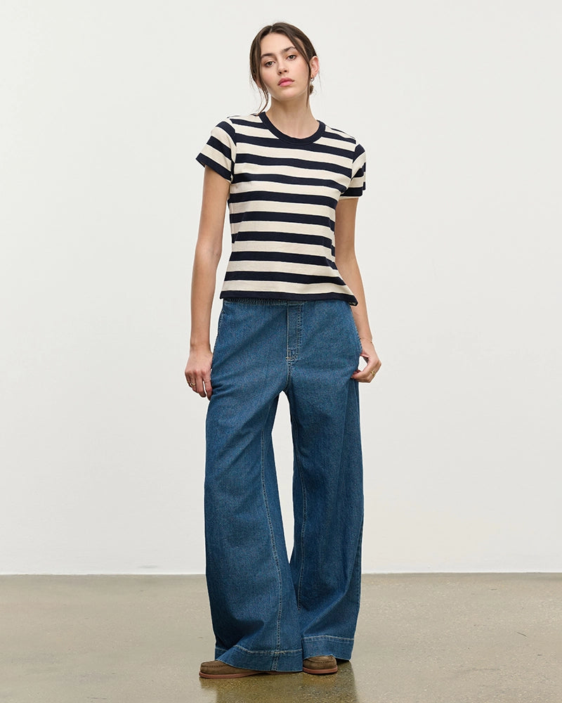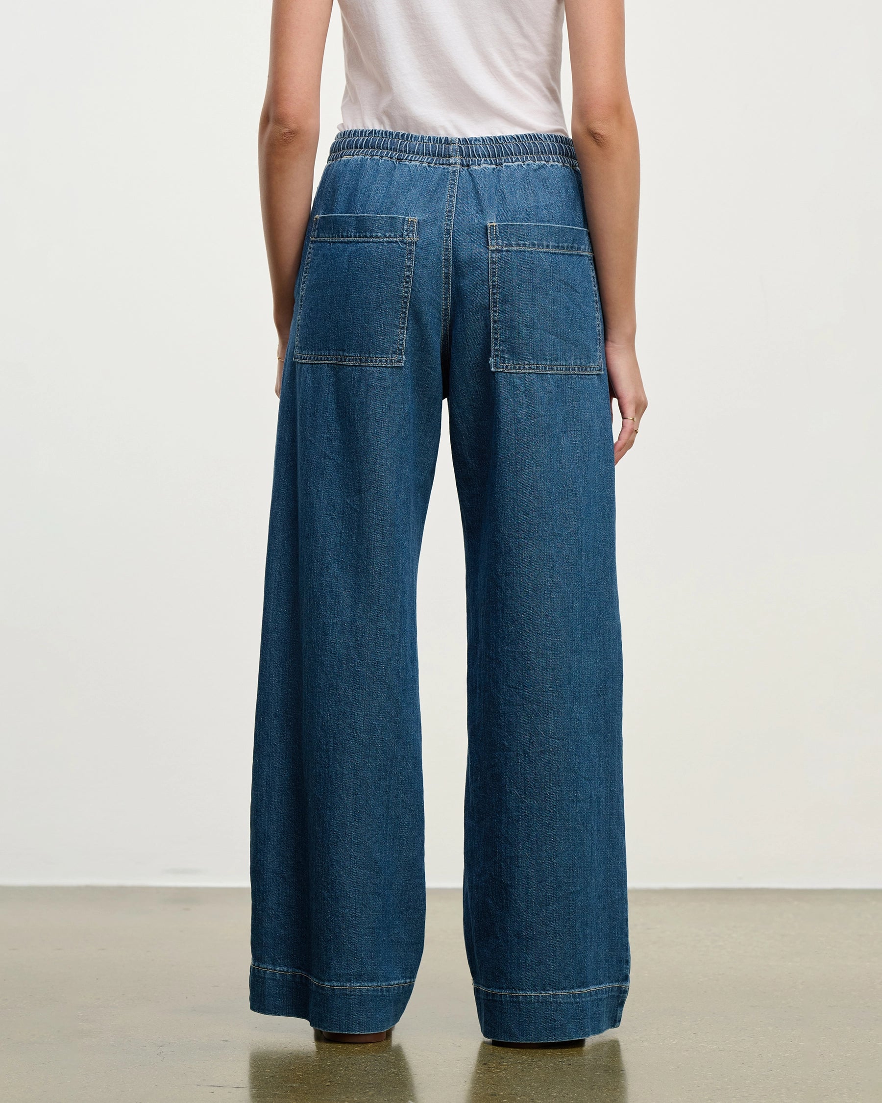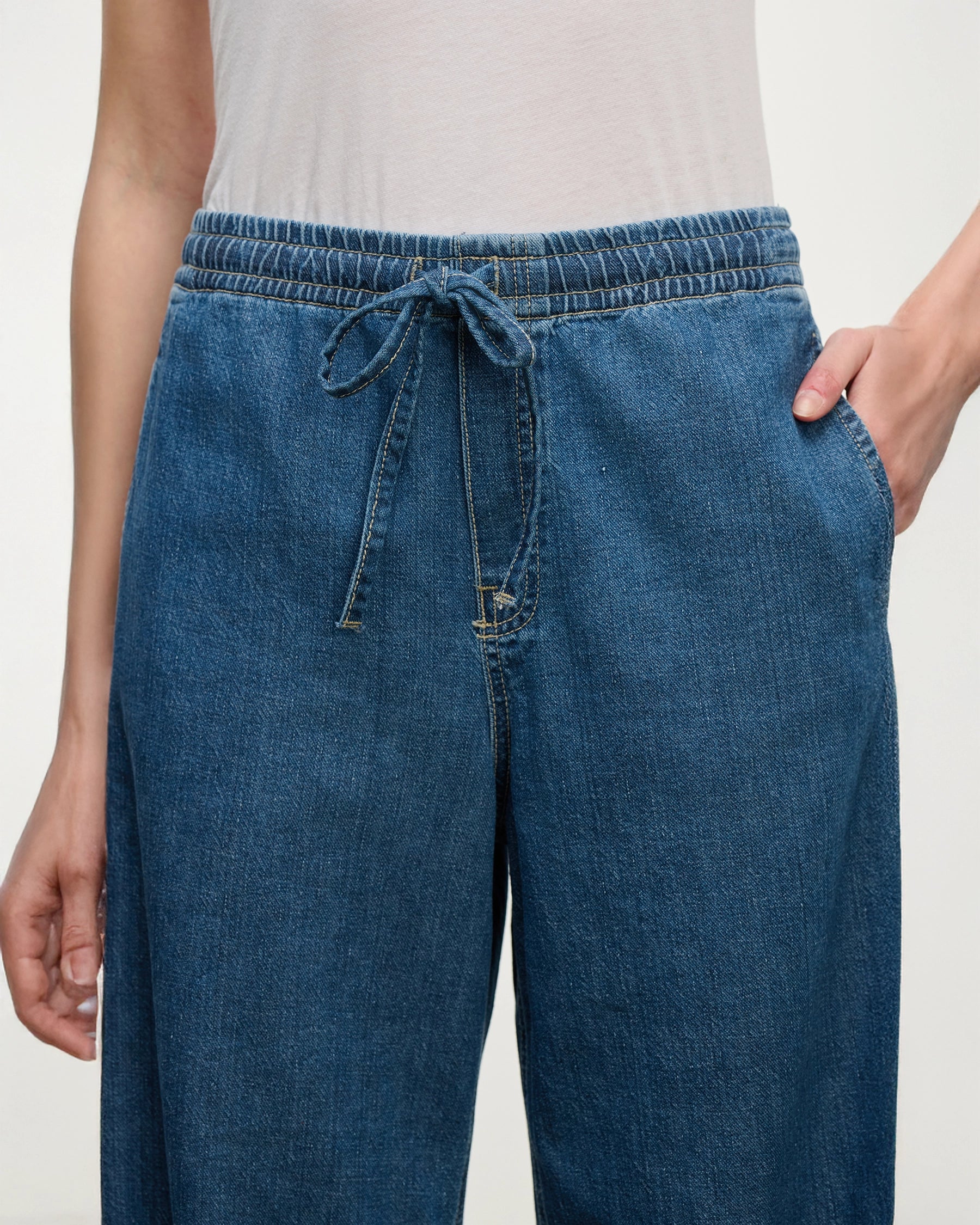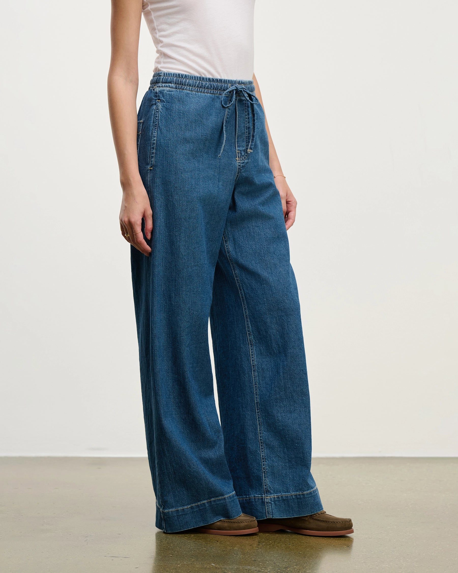 Elevate your everyday wardrobe with this soft denim pant. Designed with a drawstring elastic waist and wide-leg silhouette, this pant offer a relaxed yet polished look. With side seam and rear patch pockets, they blend effortless style with practical comfort—ready to wear on repeat.