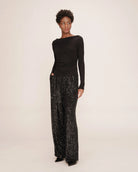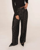 Made from a sequin-embellished fabric, the TOBY wide trousers are an iconic piece of the Grace & Mila festive collection. This piece features a high elasticated waist, front Italian pockets, and pleats at the waist. The classic cut suits all body types and creates a bright and elegant silhouette.