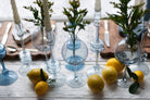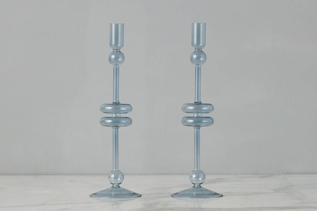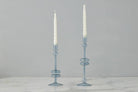 Elevate your home decor with Denim Glass Candlesticks. These expertly crafted taper candle holders add a touch of timeless elegance to any room. Available in two sizes and three colors, they are perfect for adding a pop of color to your dinner party or creating a statement throughout your home. Mix and match the sizes and colors to create a memorable tablescape. These candlesticks pair perfectly with our Twisted Taper Candles. * Hand wash only. Never use sharp objects to remove hardened wax drips. * Affix stickers to the underside of each candlestick foot. Avoid placing stickers on any other part to preserve the organic color finish.
