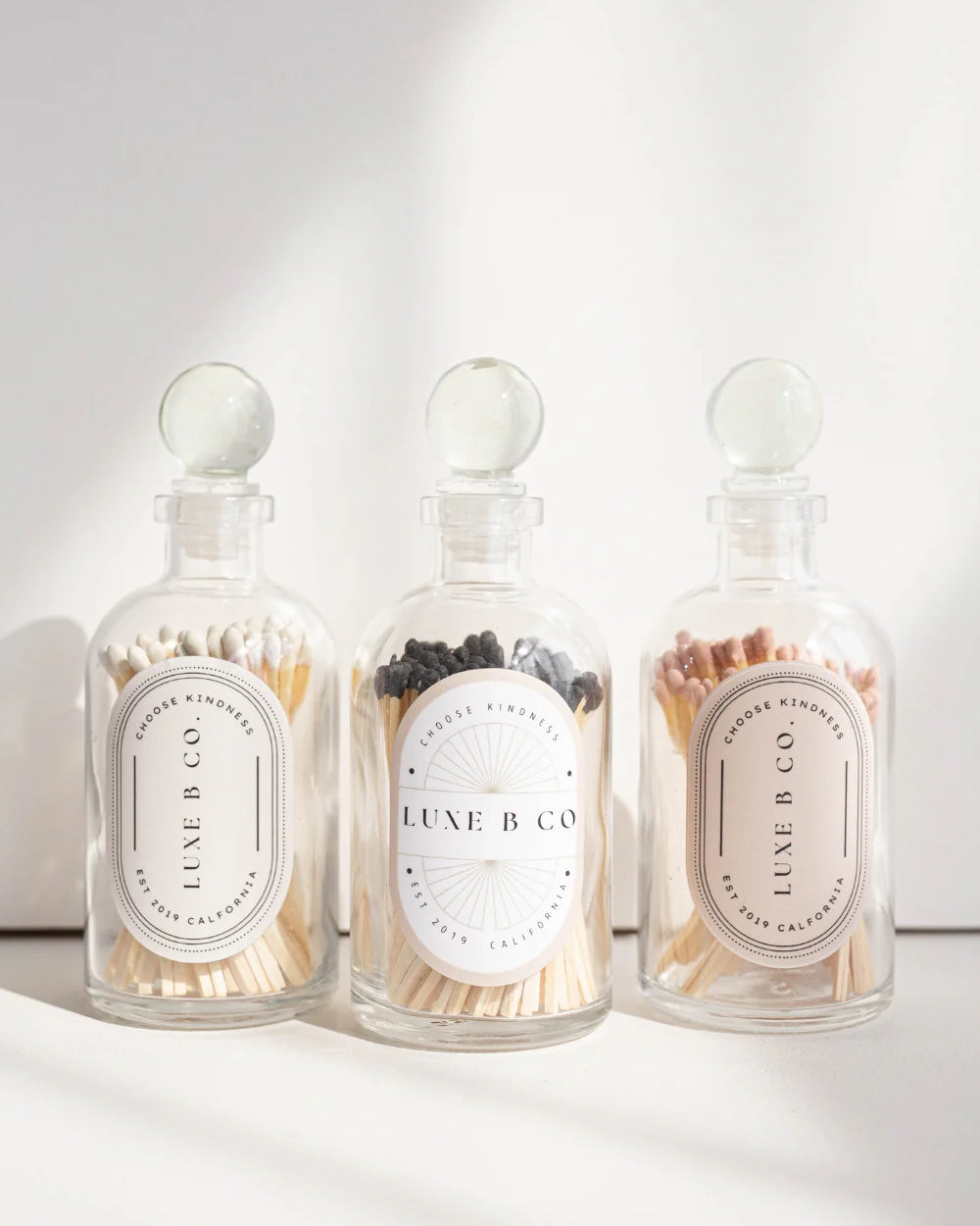 Upgrade your home decor with Match Bottles White by Luxe B Co. Each bottle holds a generous amount of matches and the sleek black design adds a touch of elegance. Keep your matches handy and organized with this stylish addition to your home.