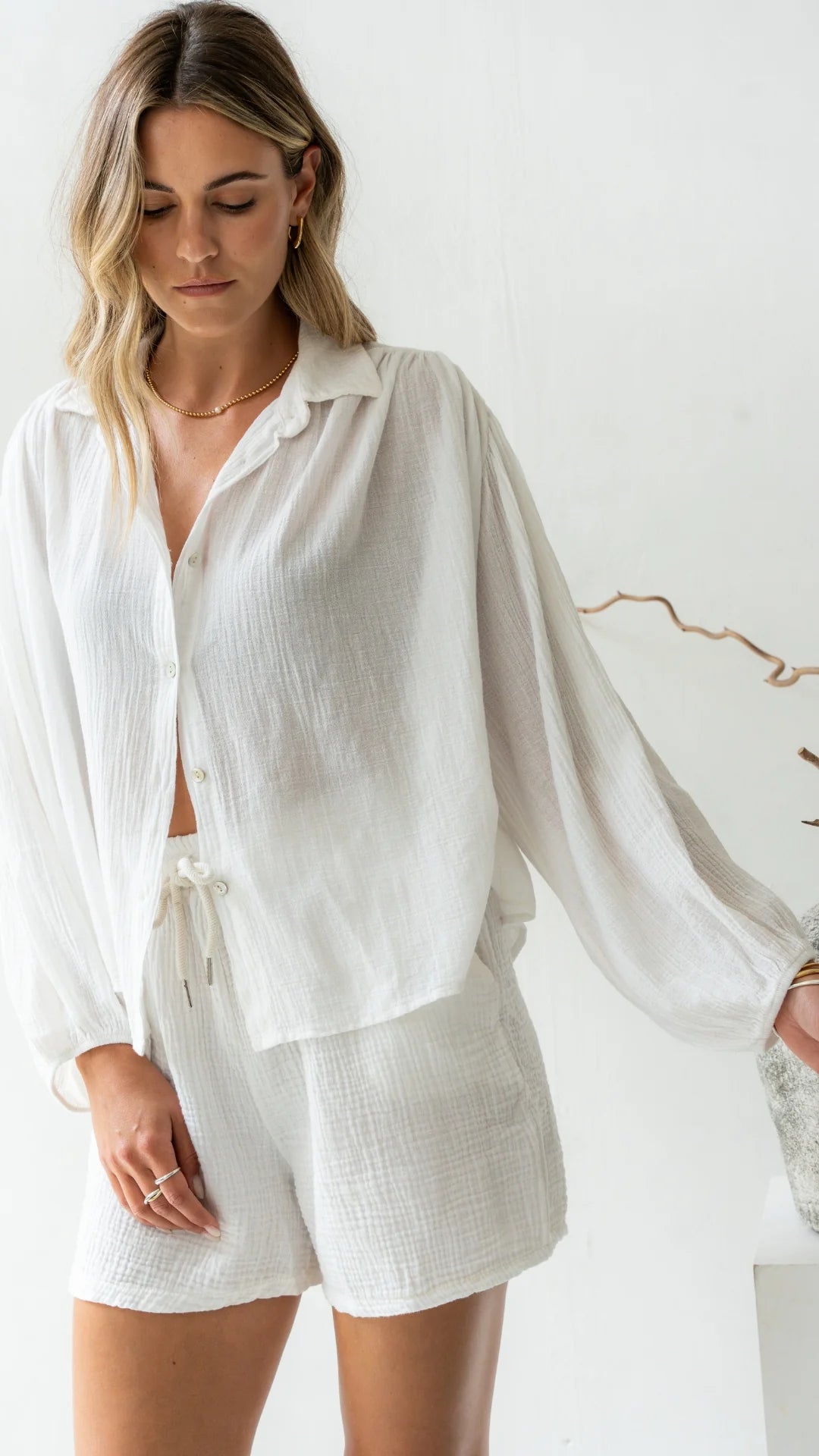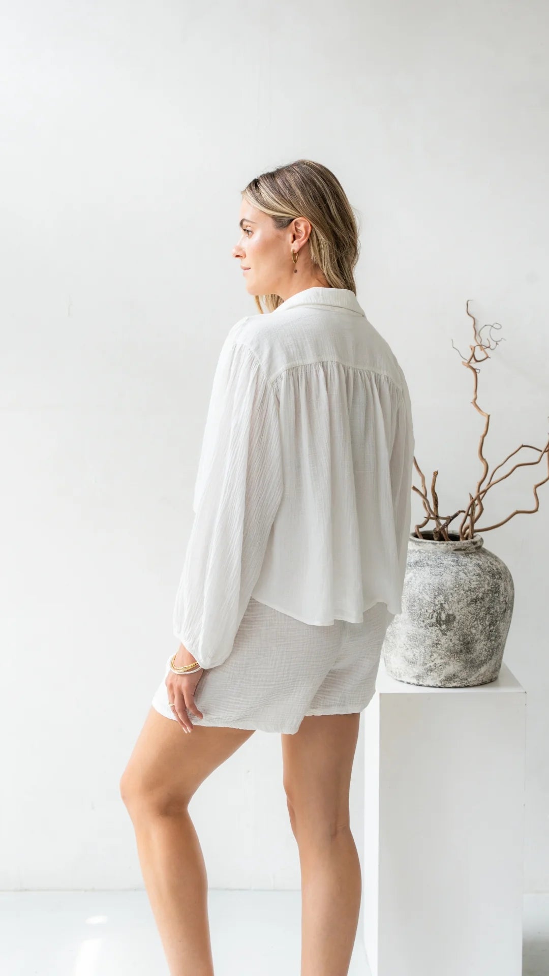 Versatile soft cotton crinkle collared shirt is an easy way to elevate your off duty look. Relaxed fit with balloon sleeves makes a great styling foundation piece that can be teamed with denim, higher waisted trousers or with matching Anais shorts for a co-ord look. Pearl buttons give a luxe feel to a wardrobe classic.
