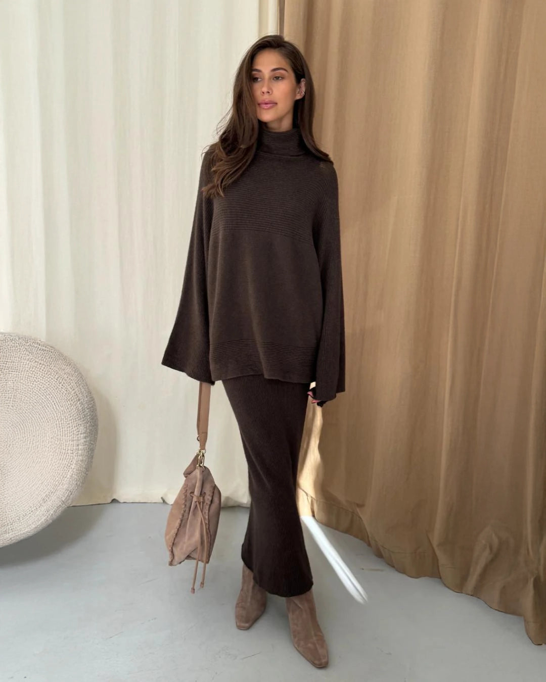 Comfortable stretch ribbed Viscose Knit midi skirt with amazing comfort and softness. Easy to team with your favourite flats or winter boots. Endless versatility and looks perfect with matching Alma Sweater as shown here