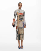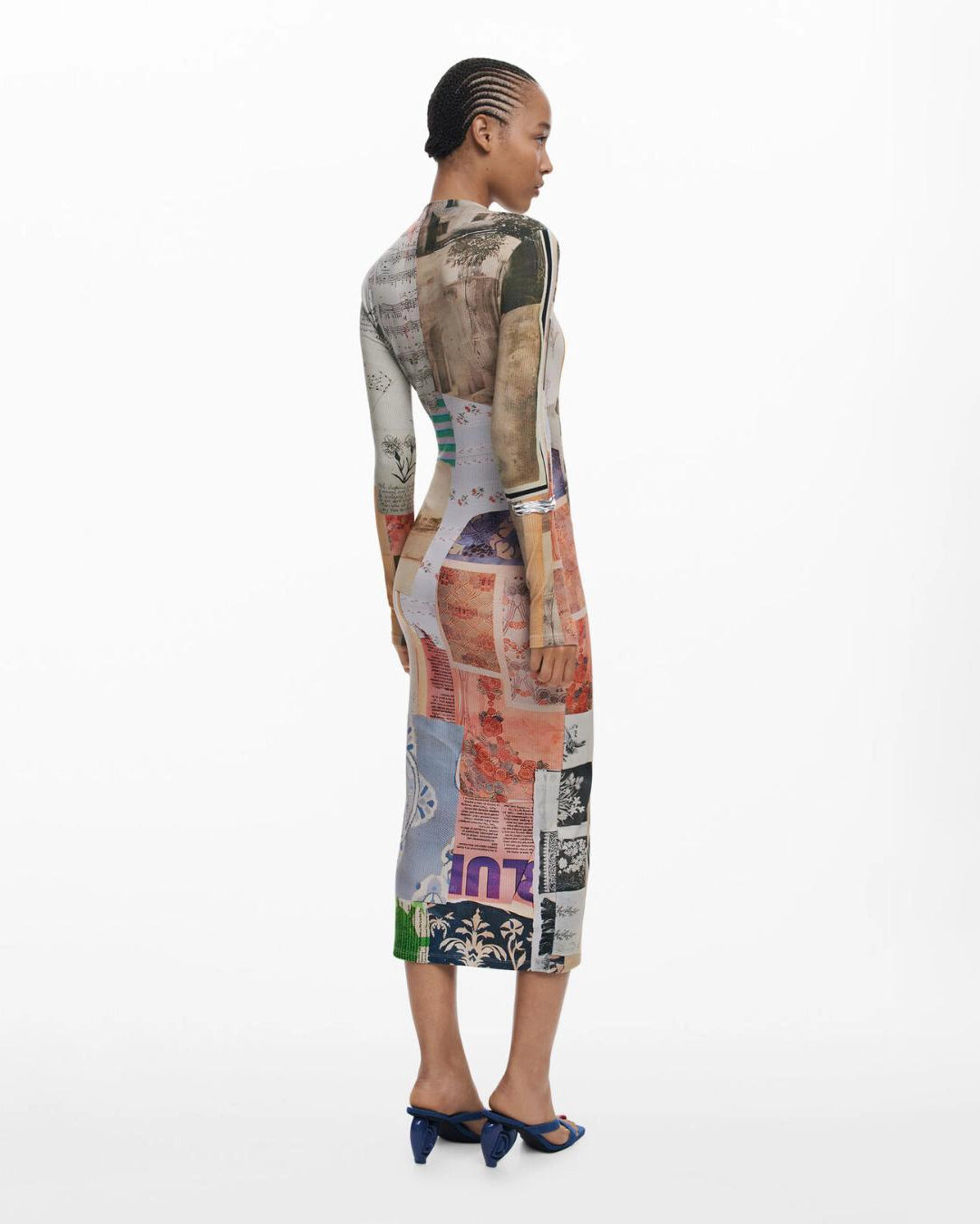 Fitted midi dress with a soft touch, long sleeves, turtleneck, and collage print.