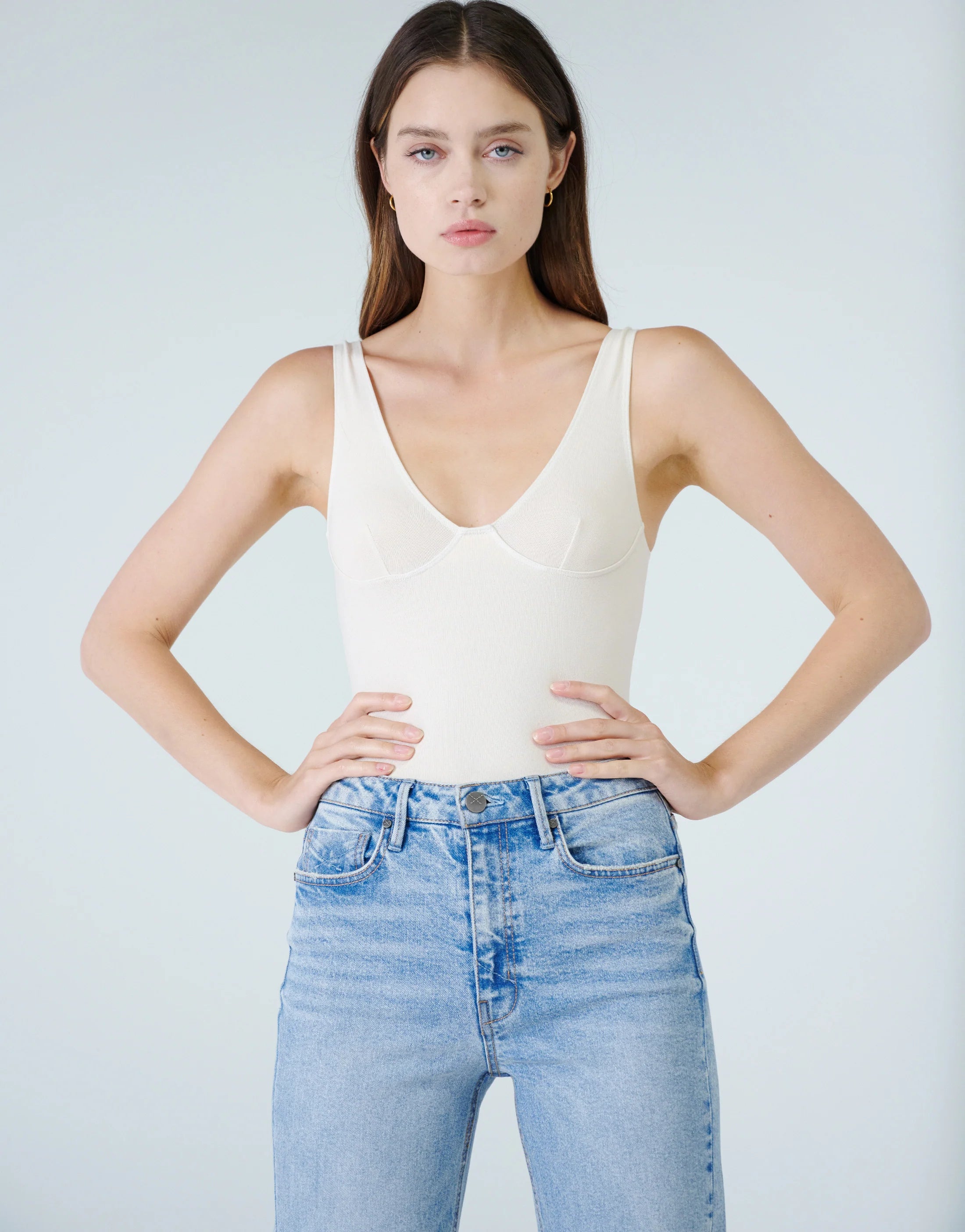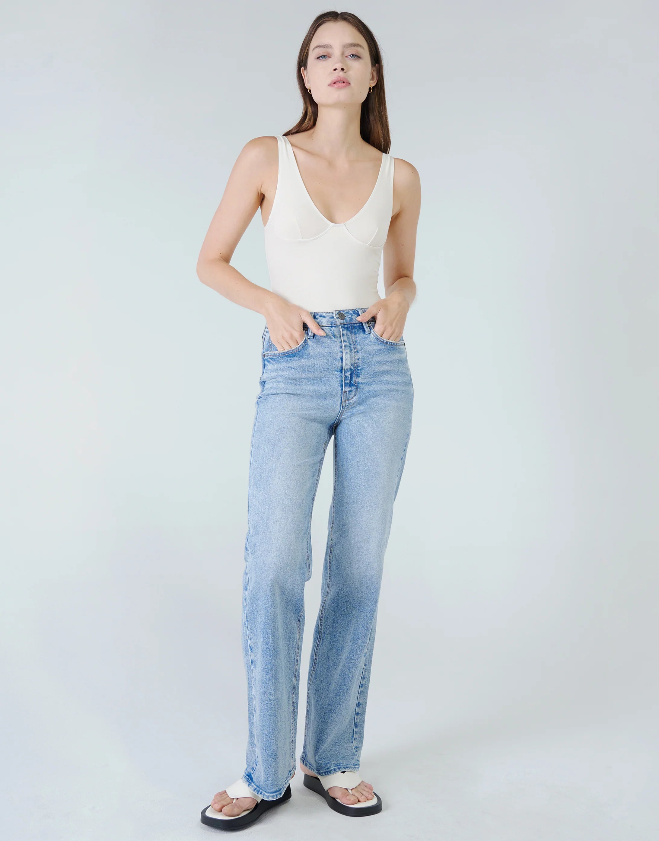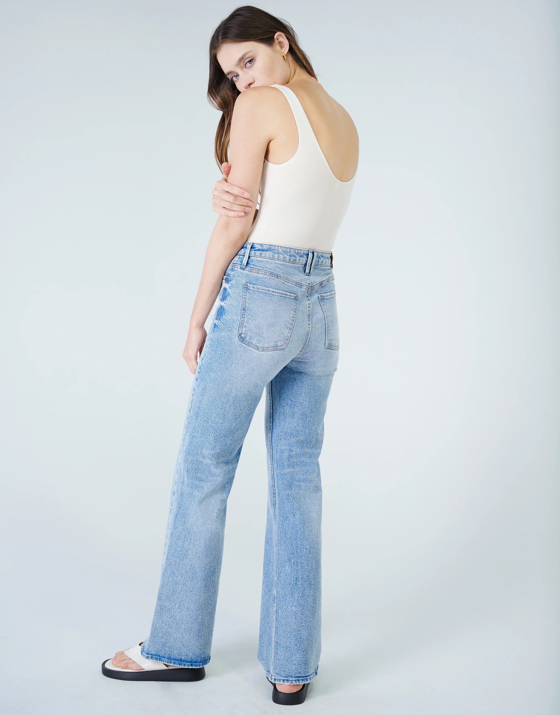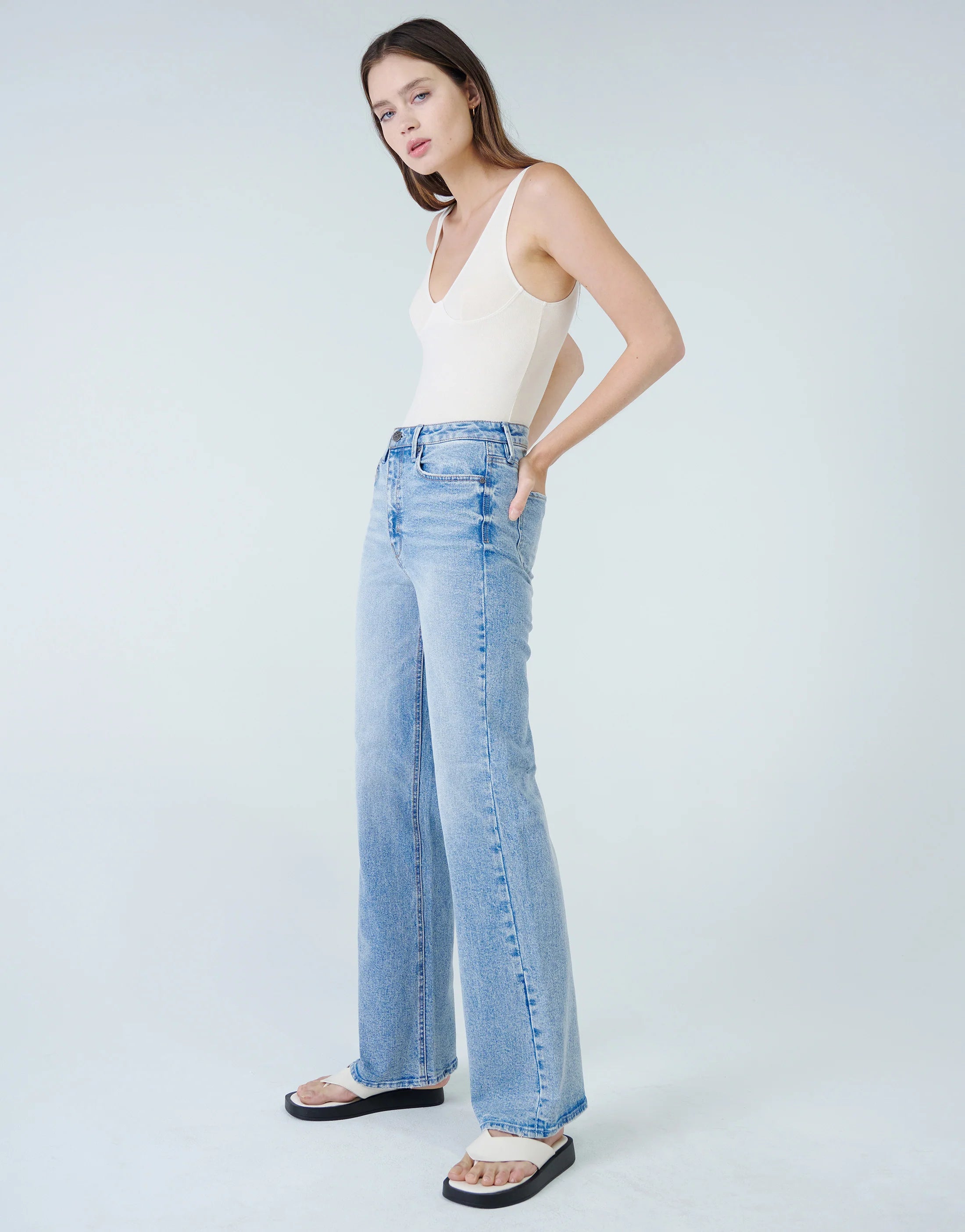 Jolene is our classic high-waisted wide leg jean. Jolene in Peace is our coolest silhouette and now in a light speckled wash. This style is fitted through the high 11" rise at the waist and hips, and loosely falls into a wide leg flare. 5-pocket styling with a button and zip fly closure.