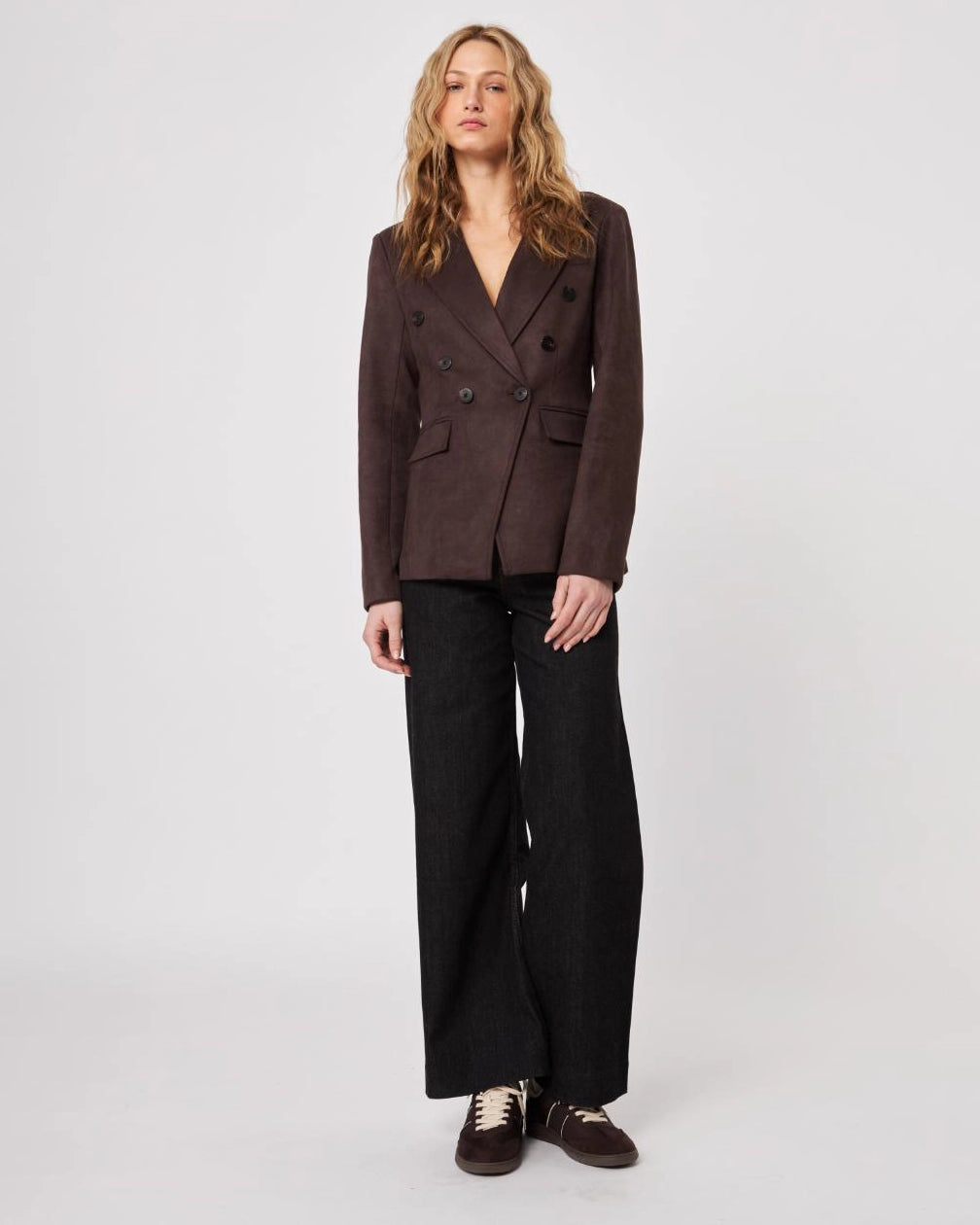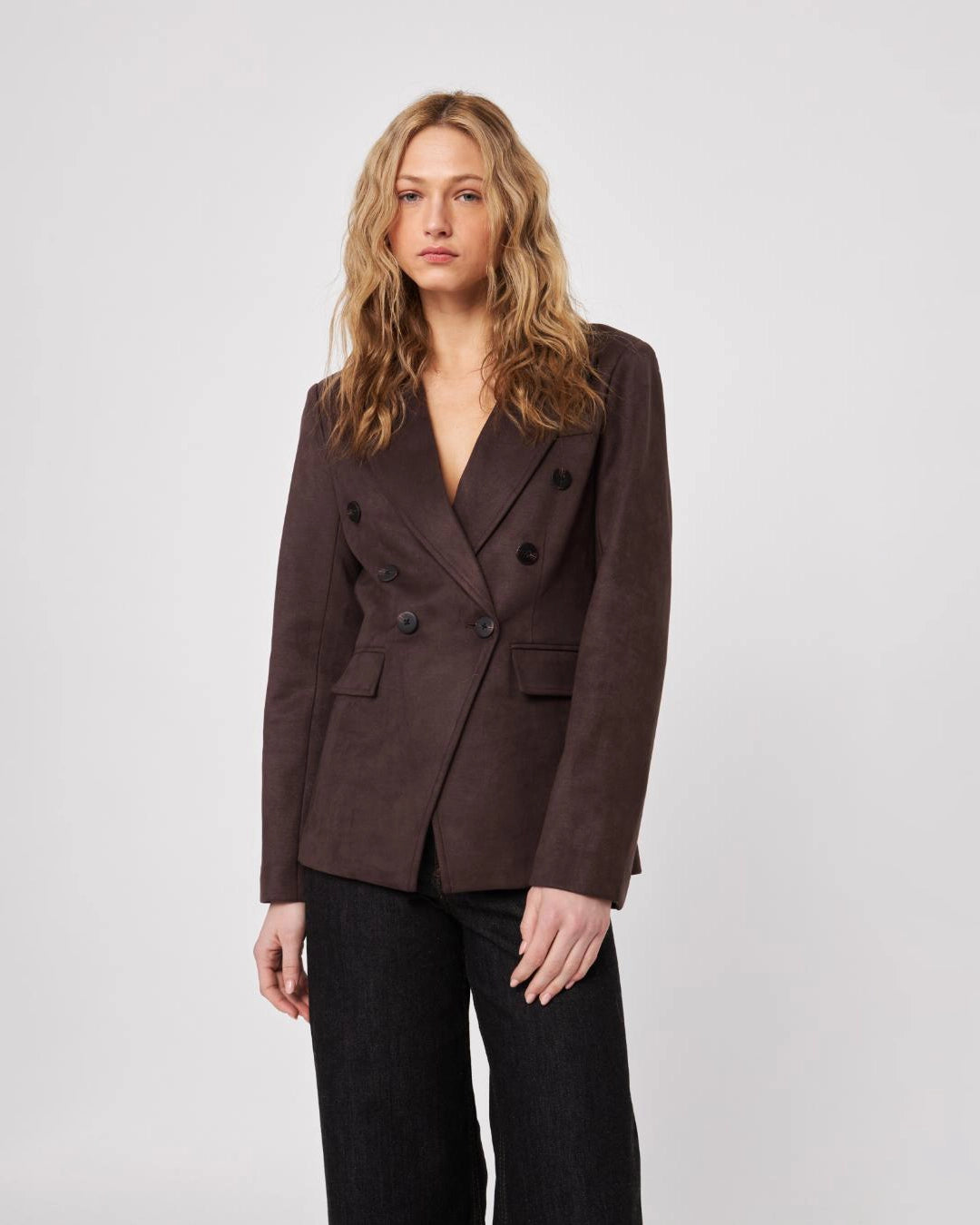 The Orson Blazer is crafted in a rich dark brown faux suede, bringing sophistication and versatility to your wardrobe. Perfectly polished for the office yet effortlessly chic for a night out.