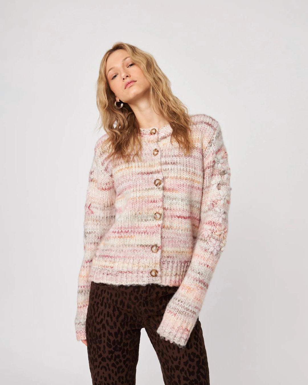 This elevated button-up cardigan features a delicate floral applique and finely printed knit details, offering subtle texture and design. Perfect for layering or worn alone, it is an essential piece for any wardrobe.
