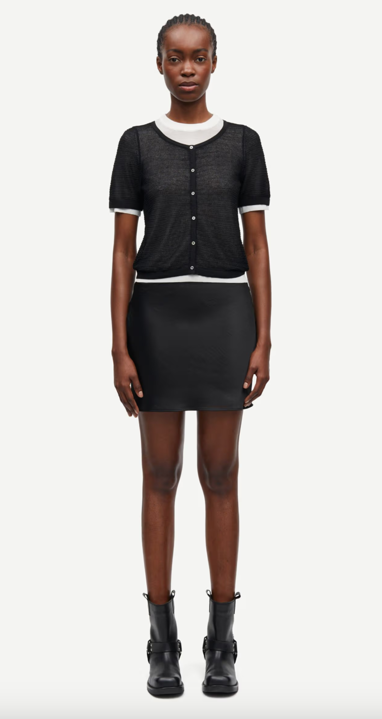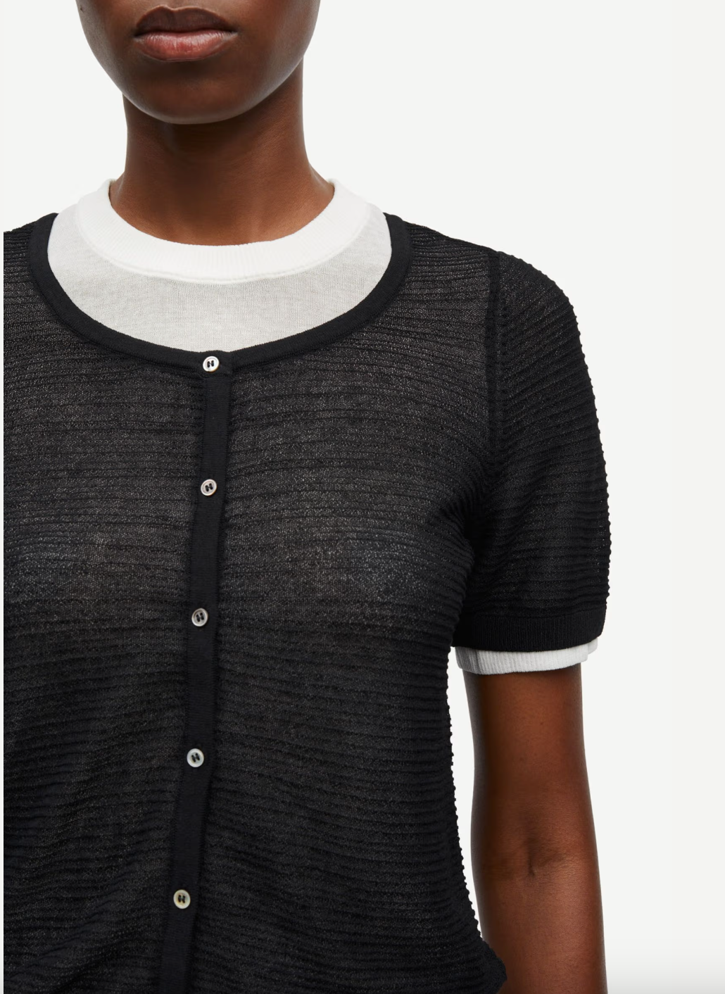 Short-sleeved semi-sheer cardigan and short-sleeved T-shirt with a slim fit. Button closure on the front of the cardigan and rib-knitted cuff and hem. Rib-knitted crew neck on the T-shirt. Pieces attached to each other with a stitch. Main material of the cardigan made from a blend with LENZING™ ECOVERO™ Viscose. Main material of the T-shirt made from a blend with cotton.