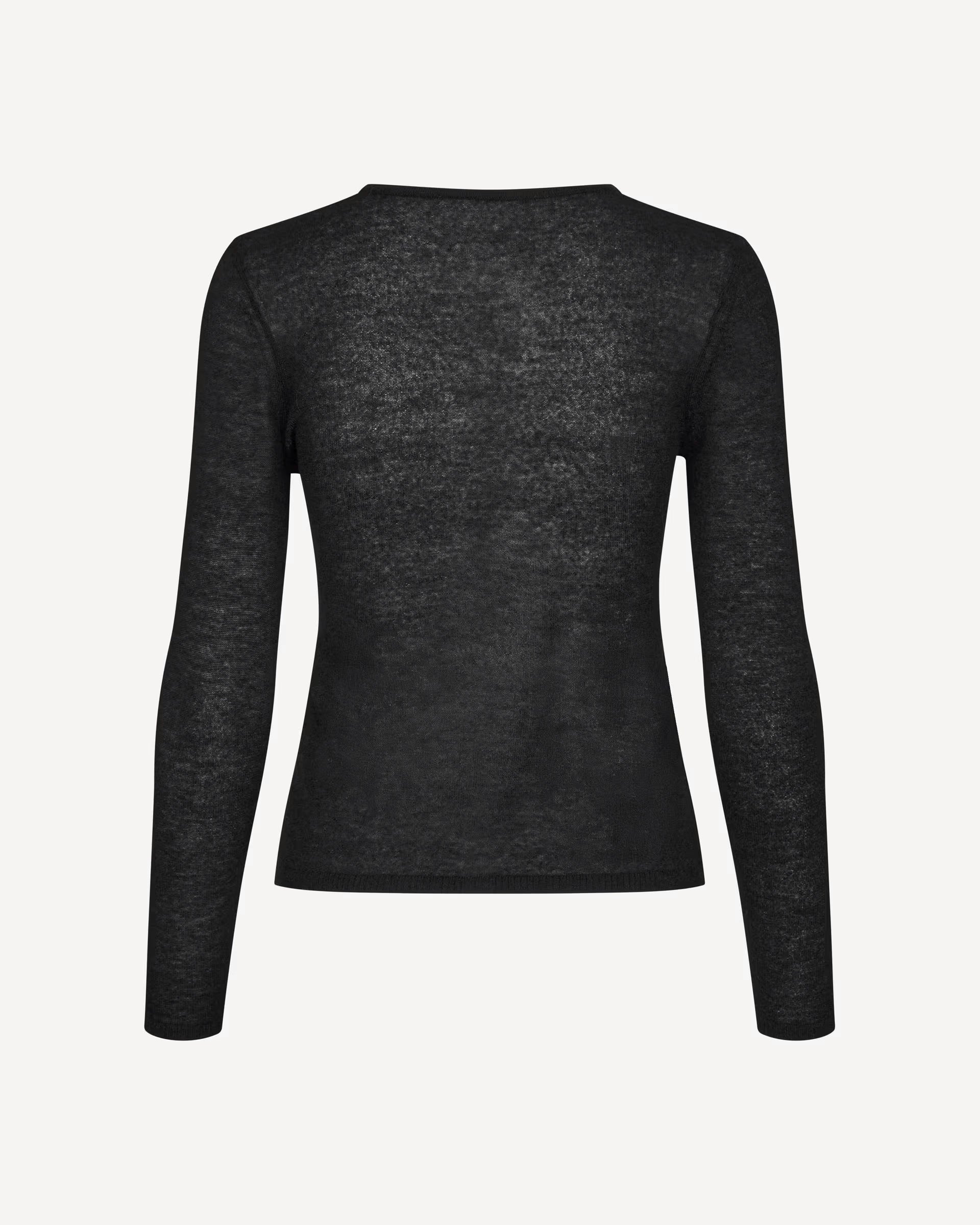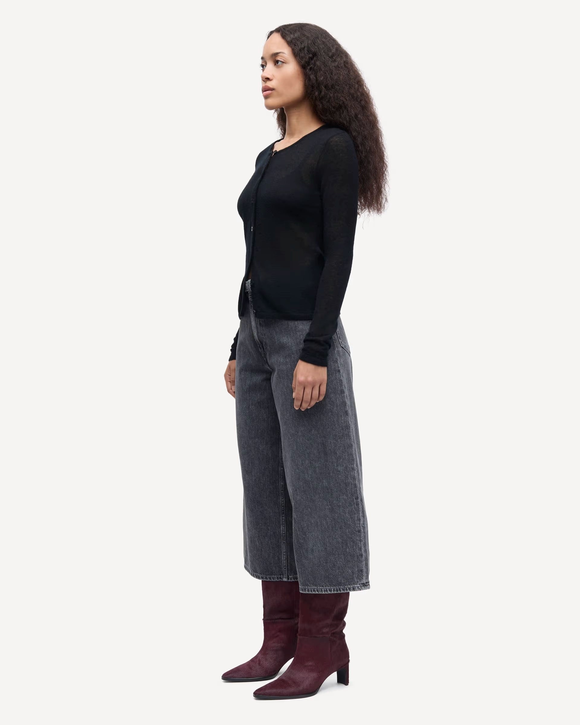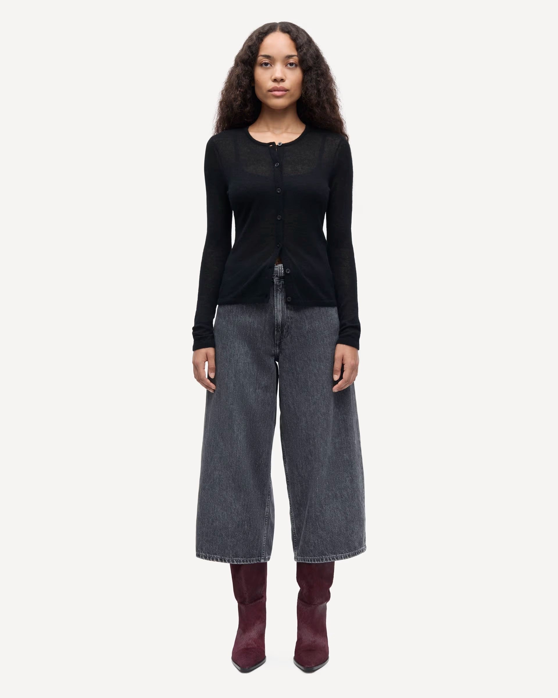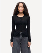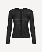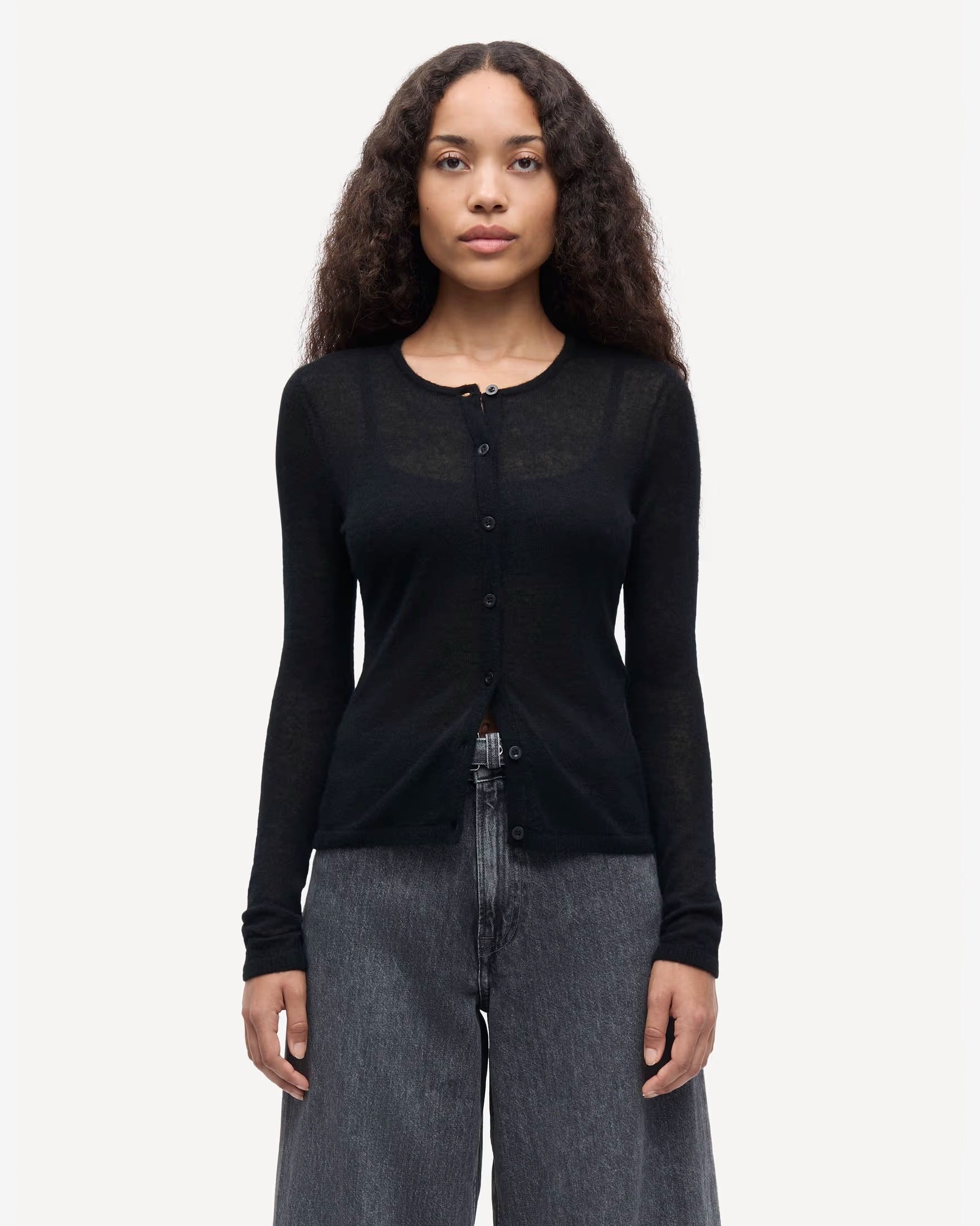 Semi-sheer cardigan with a slim fit. Button closure on the front. Round neck. Main material made from a wool-blend.