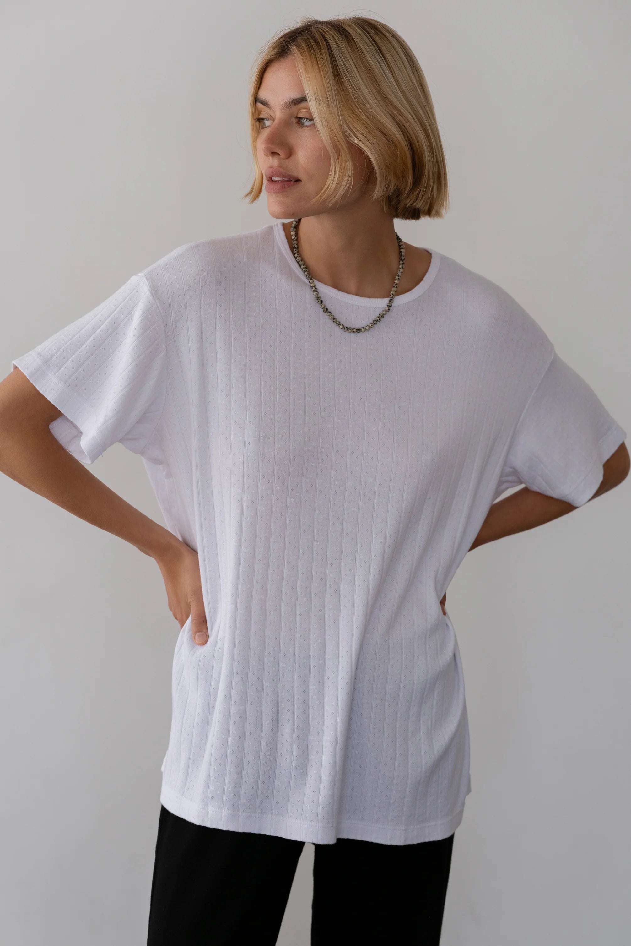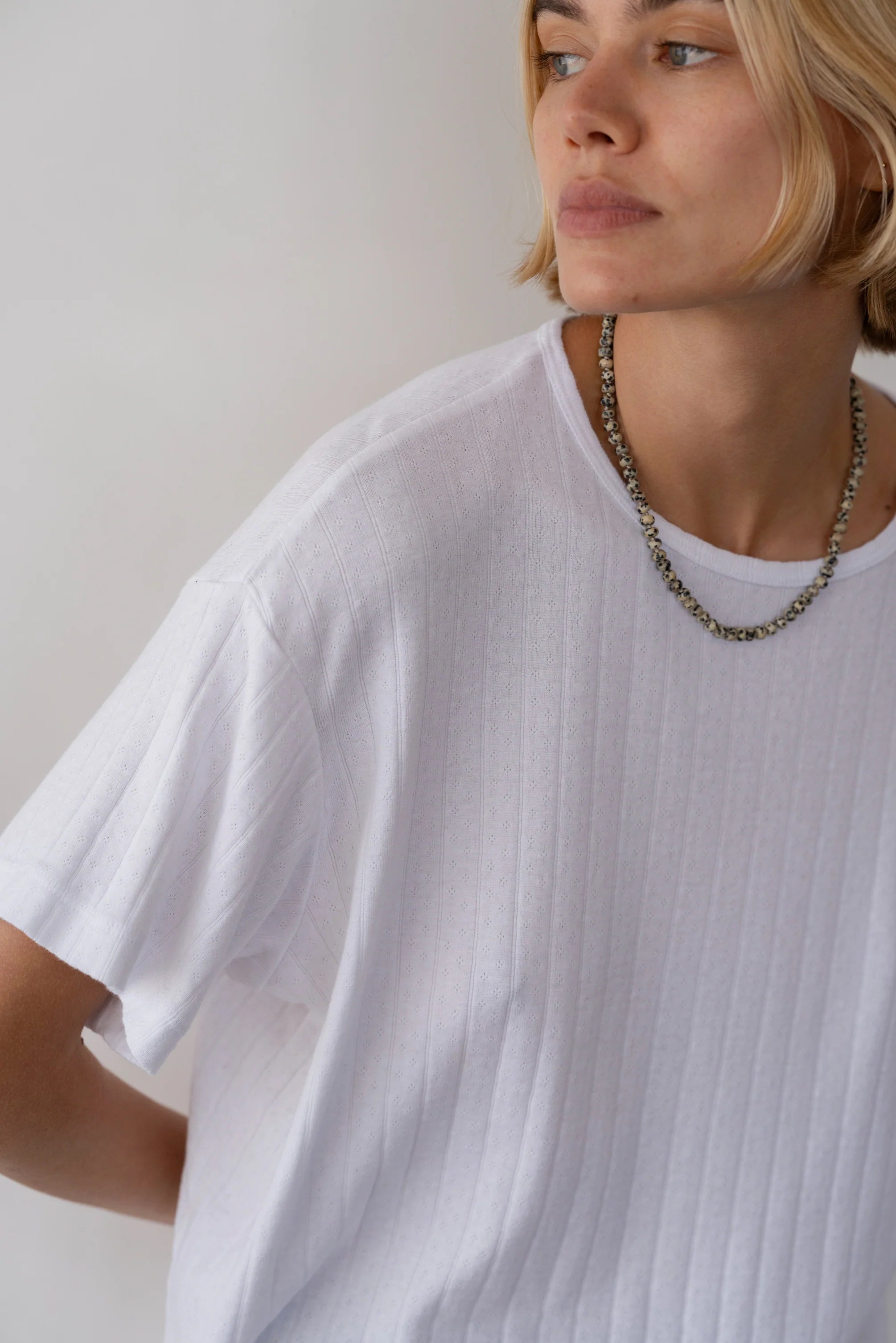 The Pointelle Oversized Tee is crafted from our signature 100% organic cotton, featuring an ultra-soft feel and a voluminous fit.