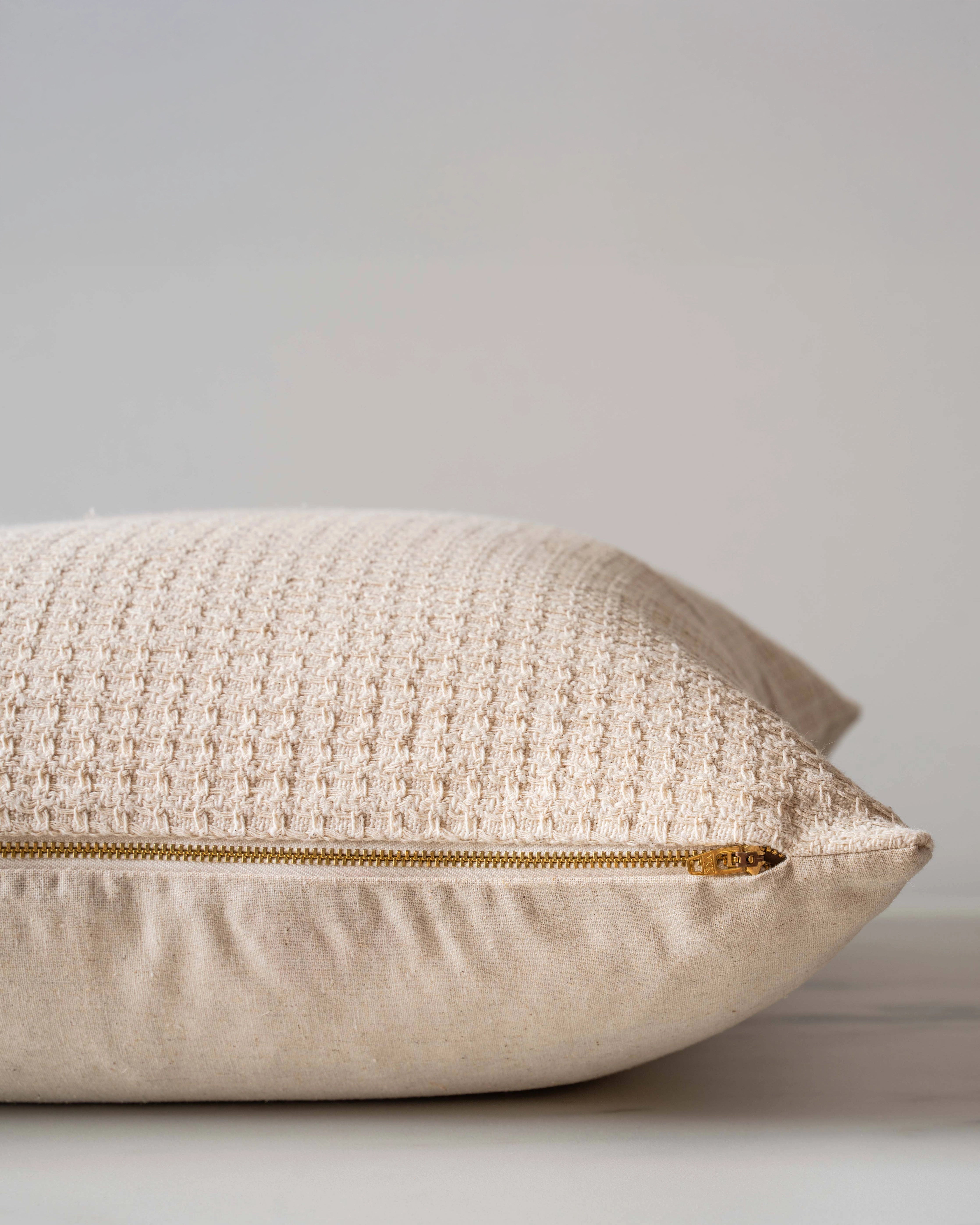 Thai cotton knit featuring a classic bamboo pattern in a warm cream, make this pillow the perfect textural addition for any living space. Style this neutral pillow with prints and patterns for a truly unique feel, or style with other neutrals for a layered, luxurious aesthetic.