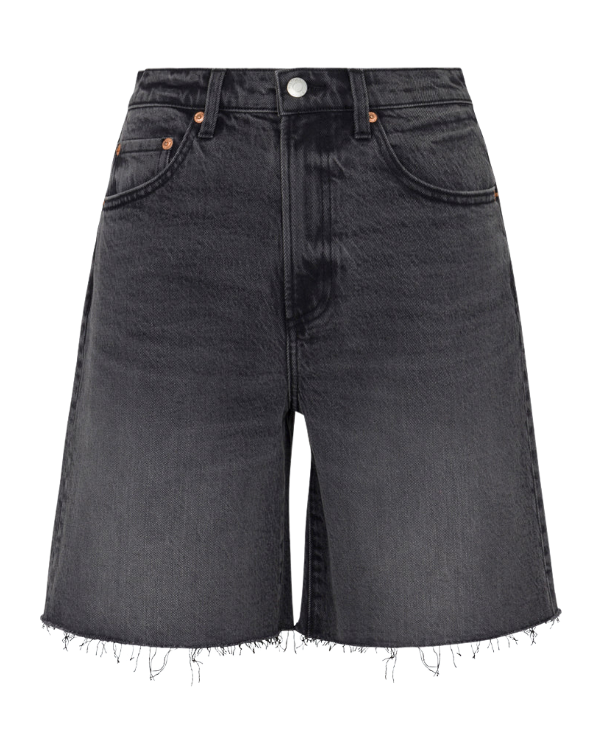 Now hitting cruising altitude. High rise, pinched waist short that falls into a long length, loose fit leg. Crafted from our signature comfort stretch denim for everyday wearability. After Hours is a washed black denim with vintage-inspired fading, light whiskering, and a frayed hem.