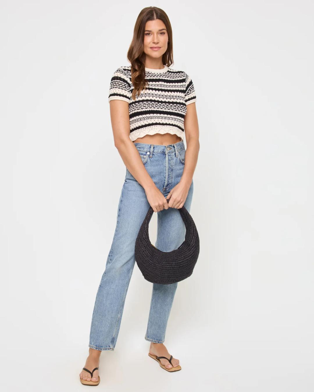 Crochet is IN! The Caicos Top is an intricate and special piece that can be worn as a matching set or paired with denim for a beach-to-street look. This crop top has a scalloped hem, short sleeve and the monochrome palette is complemented by our sweater knit crochet fabric.