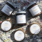 Hand poured in Fredericksburg, Virginia in amber glass jars with recycled white paper labels and white metal lids.