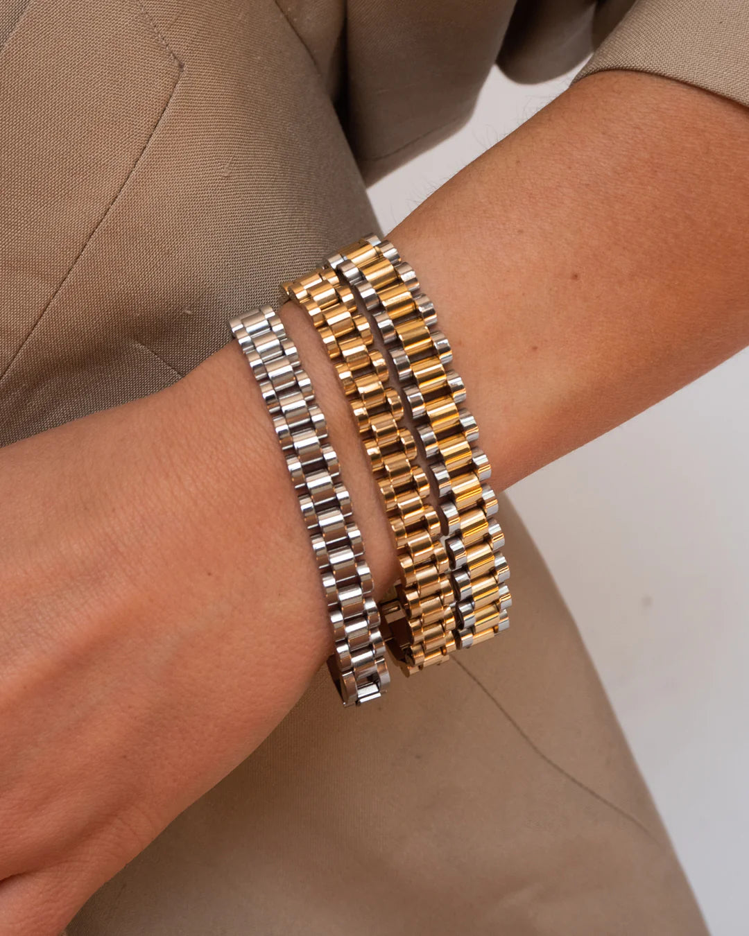 - Two-toned, brushed metal timepiece bracelet