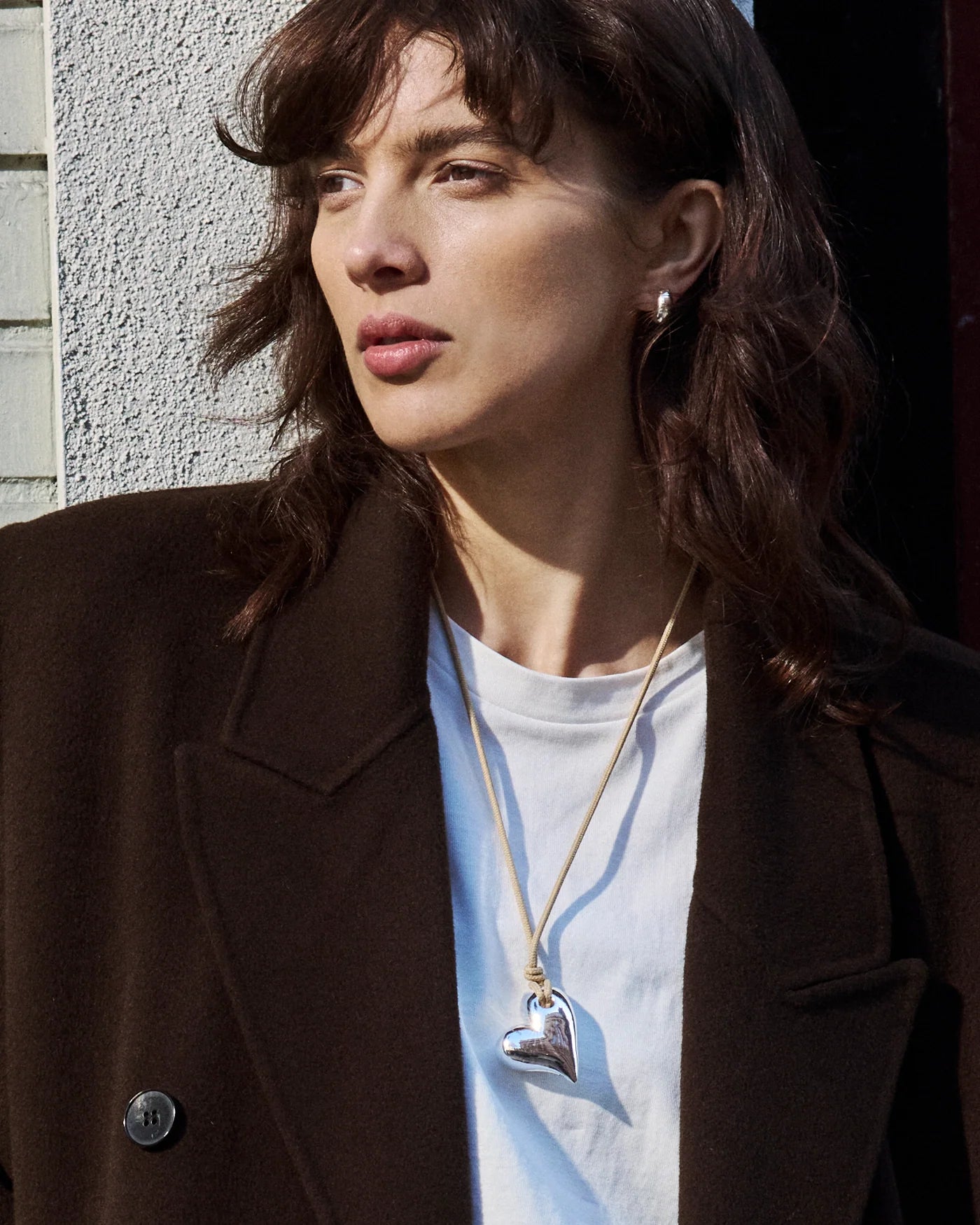 This voluminous silver heart pendant hangs from an adjustable beige cord made of recycled polyester. Finished in high-polish silver.