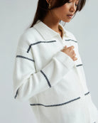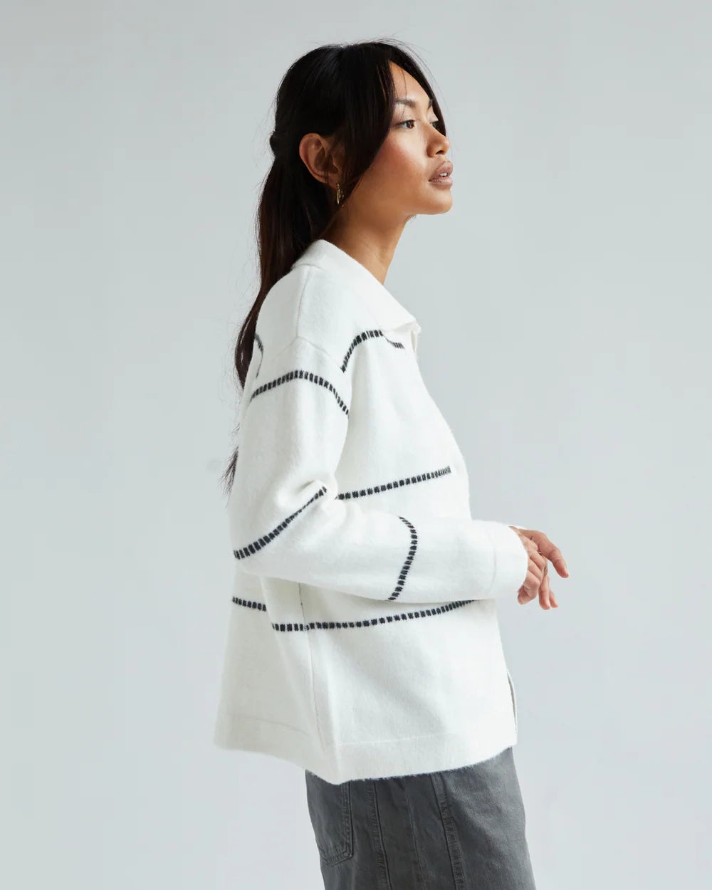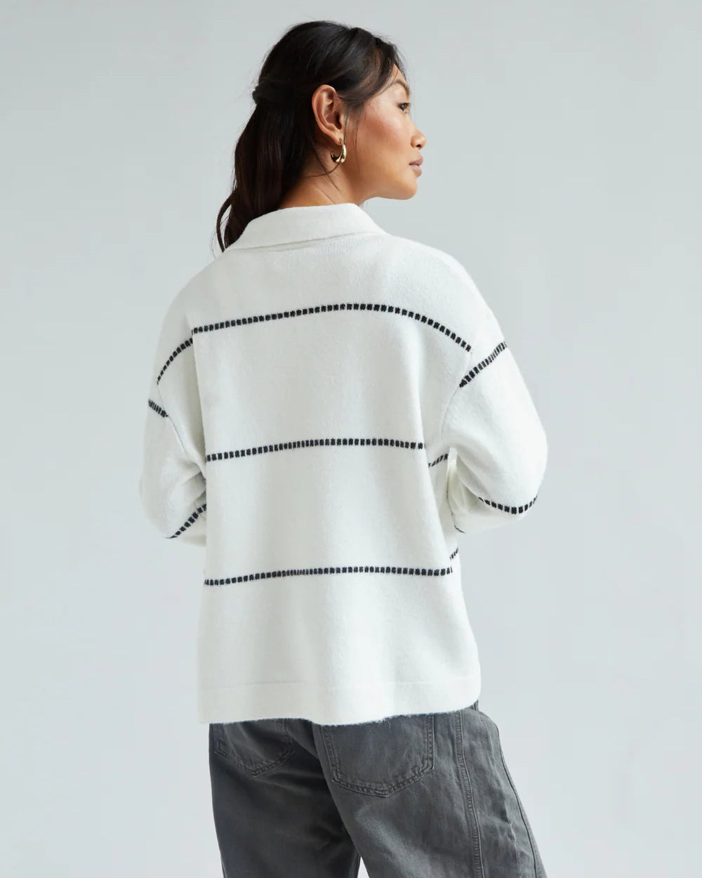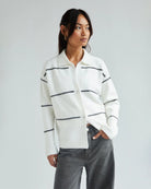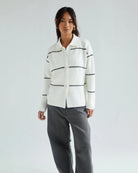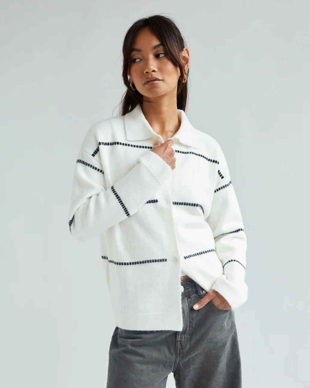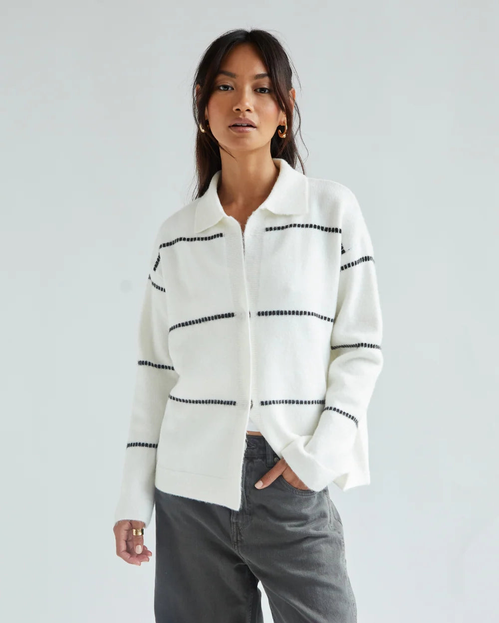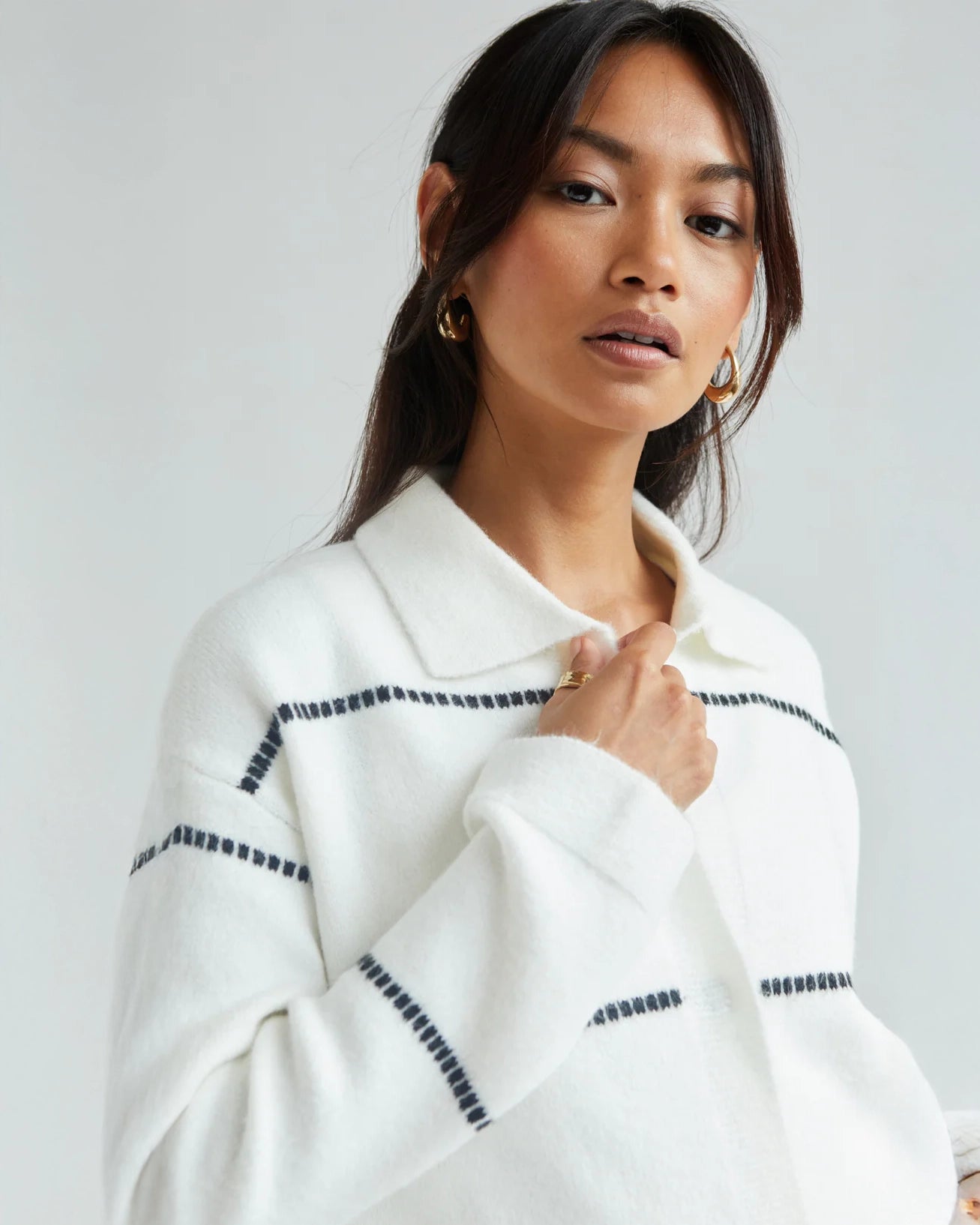 Clara is our new centre front cardigan with polo collar. Relaxed fit and contrast stripe detail give this modern essential a fashion forward edge. Wear open with a vest or tee as an easy cover up for a polished off duty outfit. Invisible metallic snap closures for a clean look