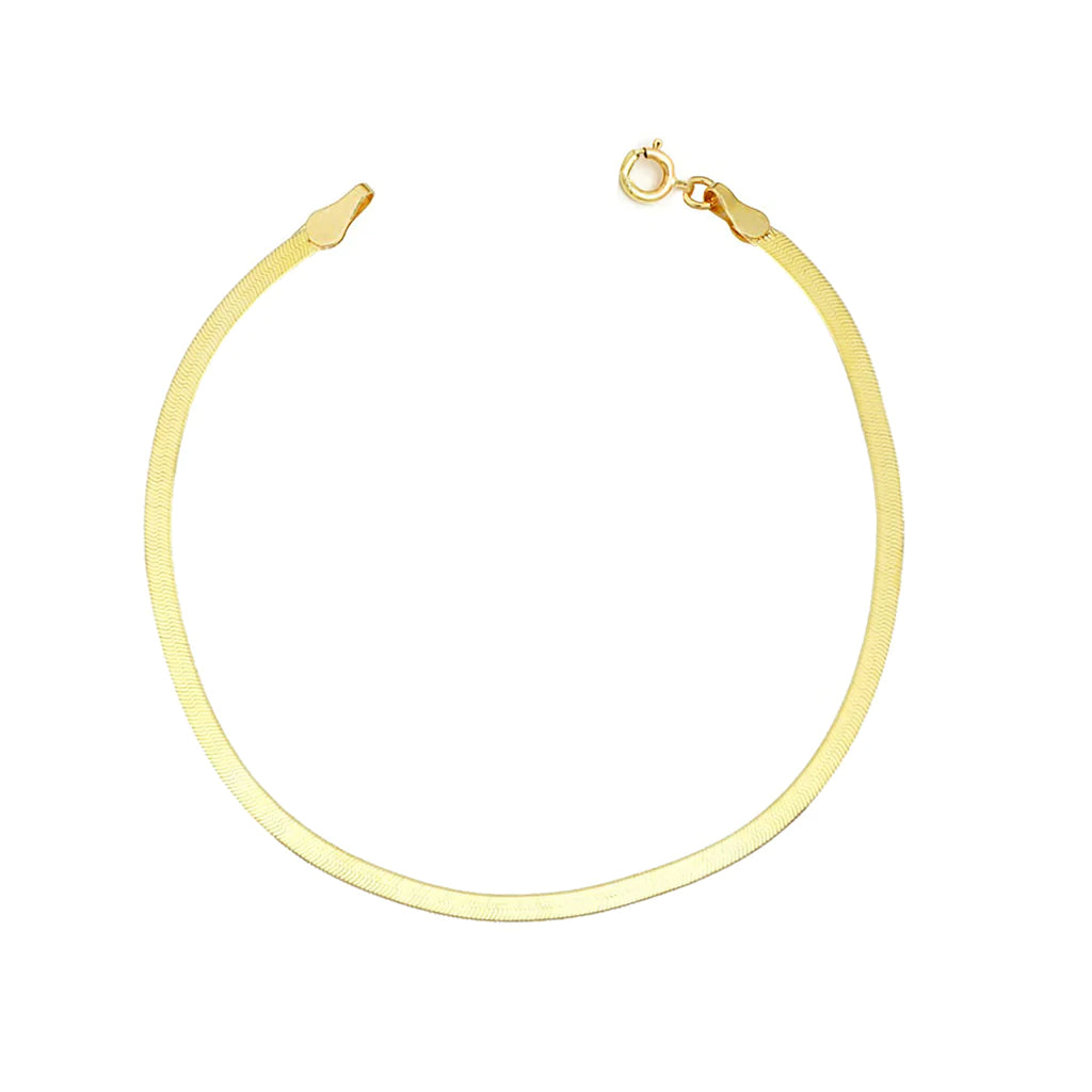 This intricately woven gold chain sits flush against your wrist and knows how to catch the light just right. Please take extra care with this delicate piece by laying it flat when stored and be mindful when taking on and off to not bend the chain.