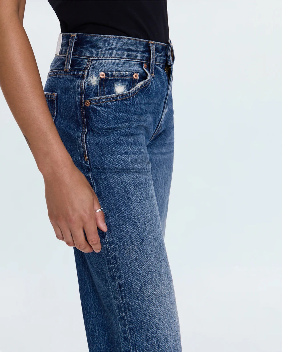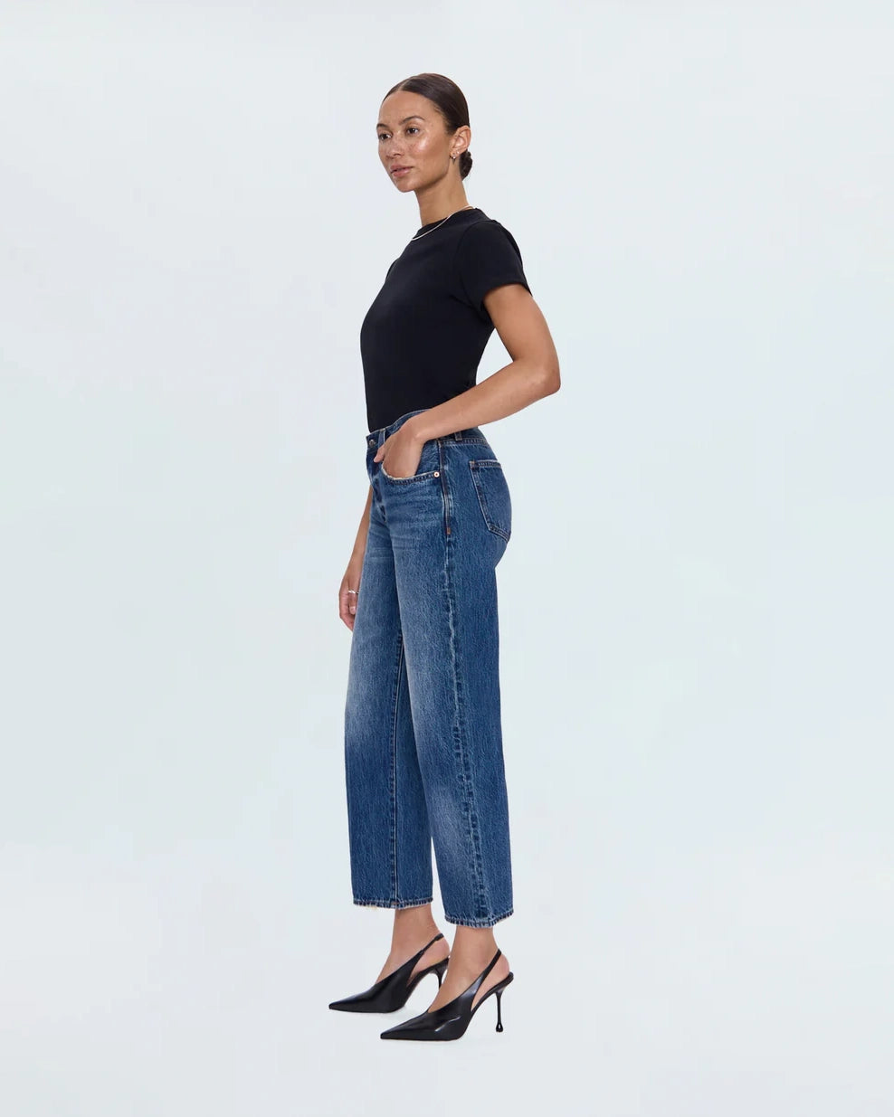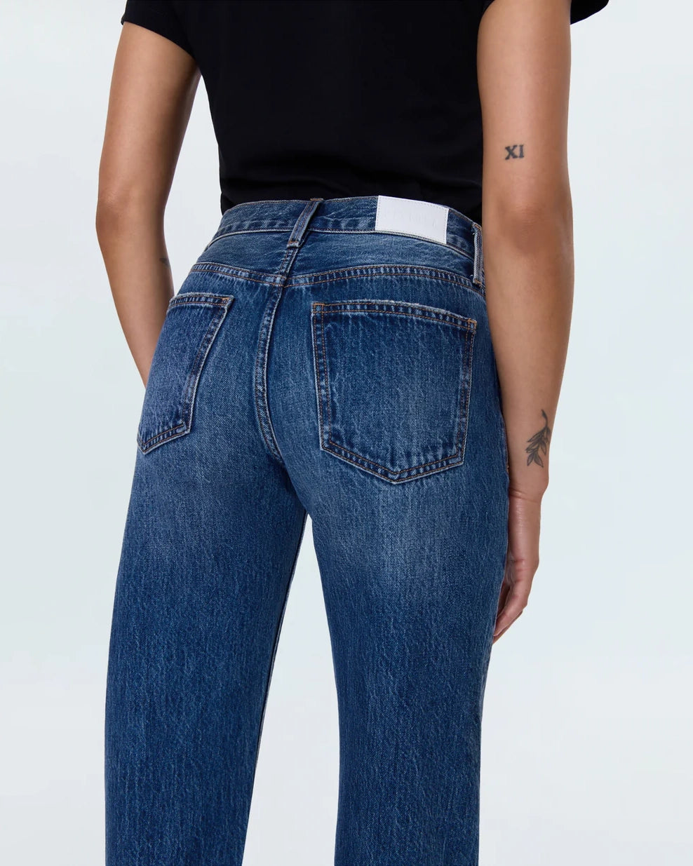 The best-selling jean that understands proportions. Lexi sits at the perfect mid-rise with our signature bowed straight leg, and a subtle curve at the knee that creates dimension without effort. Finished with a 29" inseam, the silhouette tapers to a cropped ankle with a clean hem. Crafted from our rigid denim in Artisan, a rich dark wash with gentle fading around the knees and thighs.