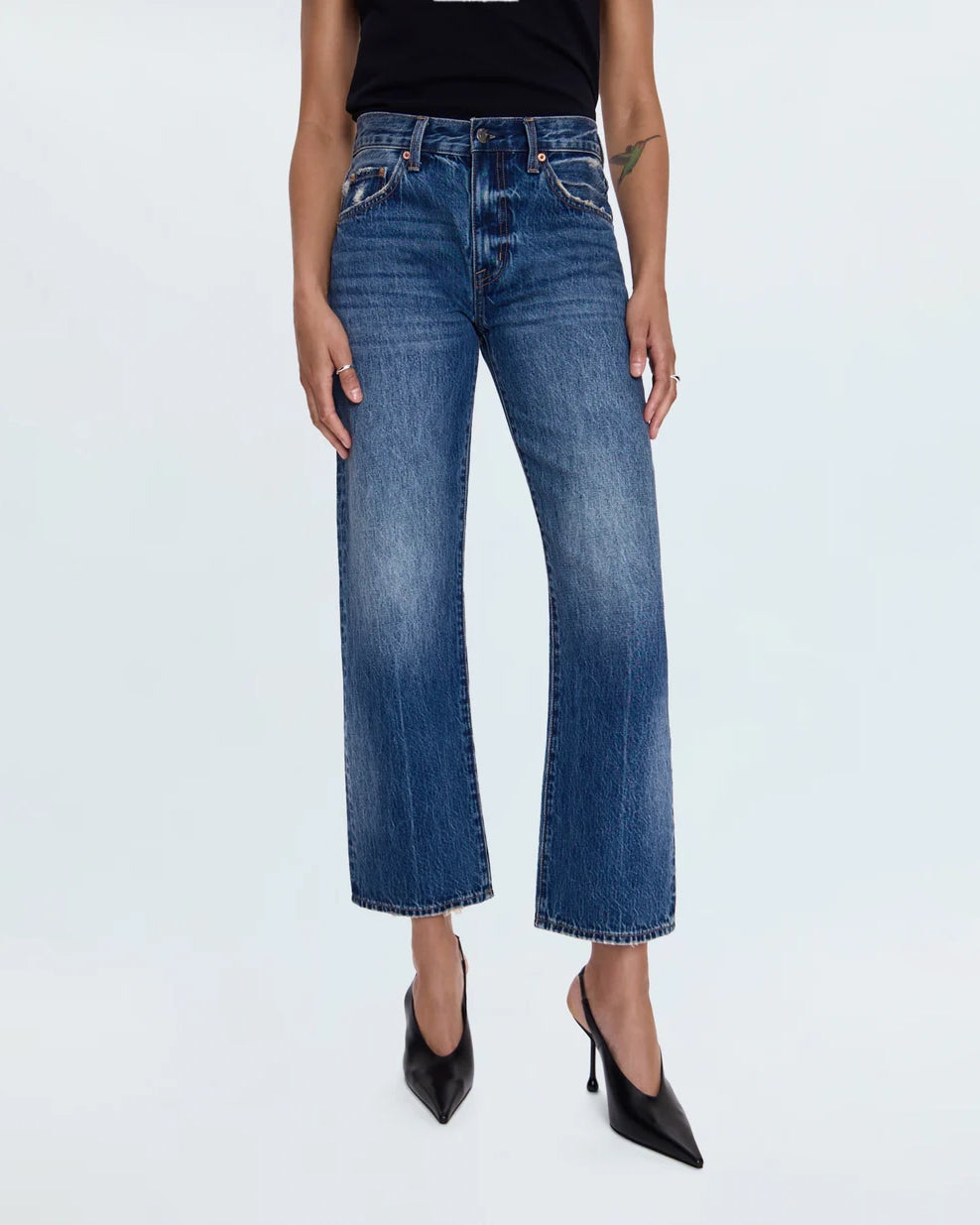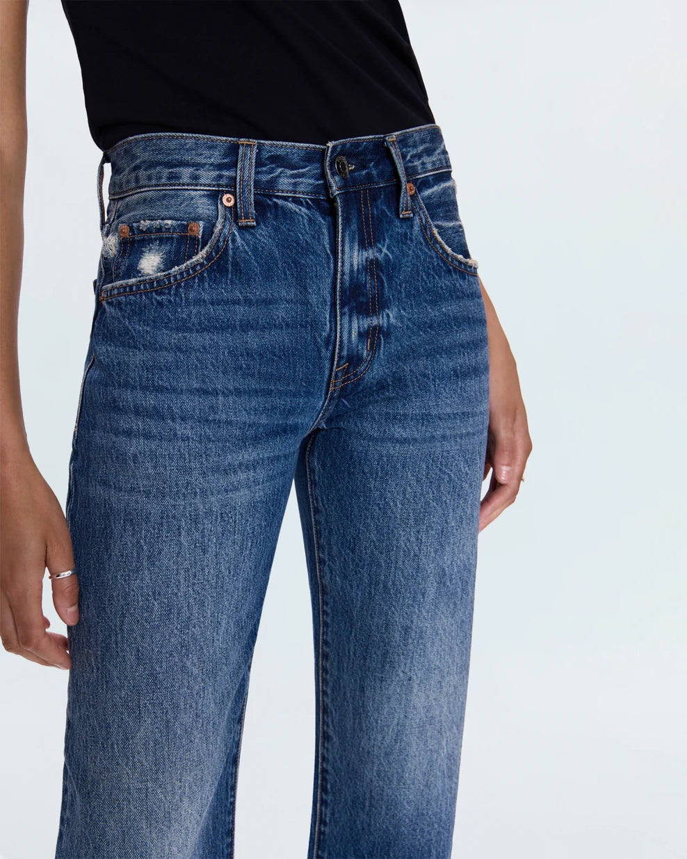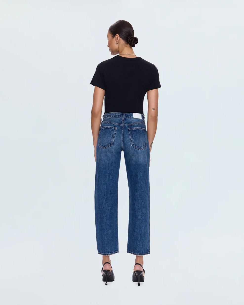 The best-selling jean that understands proportions. Lexi sits at the perfect mid-rise with our signature bowed straight leg, and a subtle curve at the knee that creates dimension without effort. Finished with a 29" inseam, the silhouette tapers to a cropped ankle with a clean hem. Crafted from our rigid denim in Artisan, a rich dark wash with gentle fading around the knees and thighs.