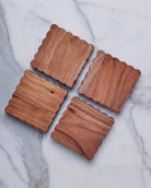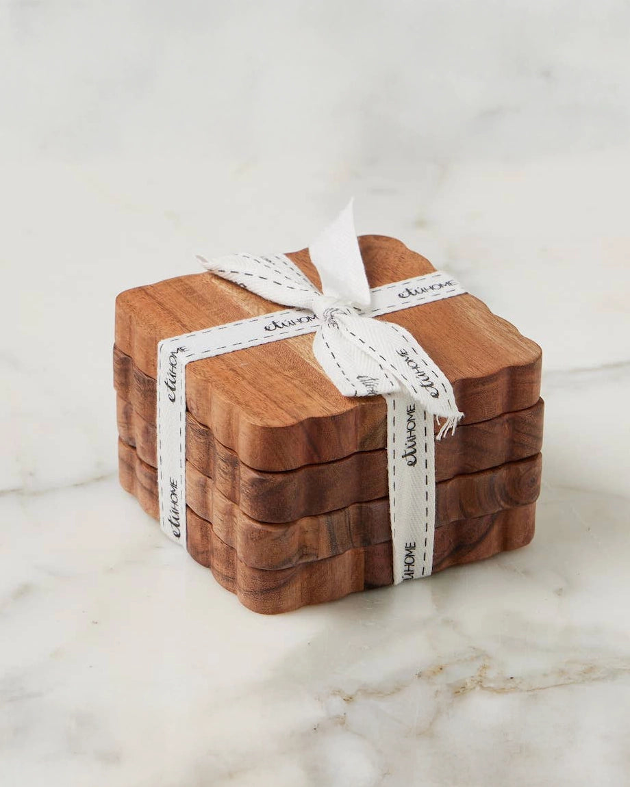 Adorn your coffee table with a charming set of Scalloped Coasters. Featuring a classic finish that showcases the natural wood grain, this set is sure to elevate interiors. The trending yet timeless scalloped edge adds a touch of sophistication to any table. Perfect for gifting to the hostess who appreciates both style and functionality.