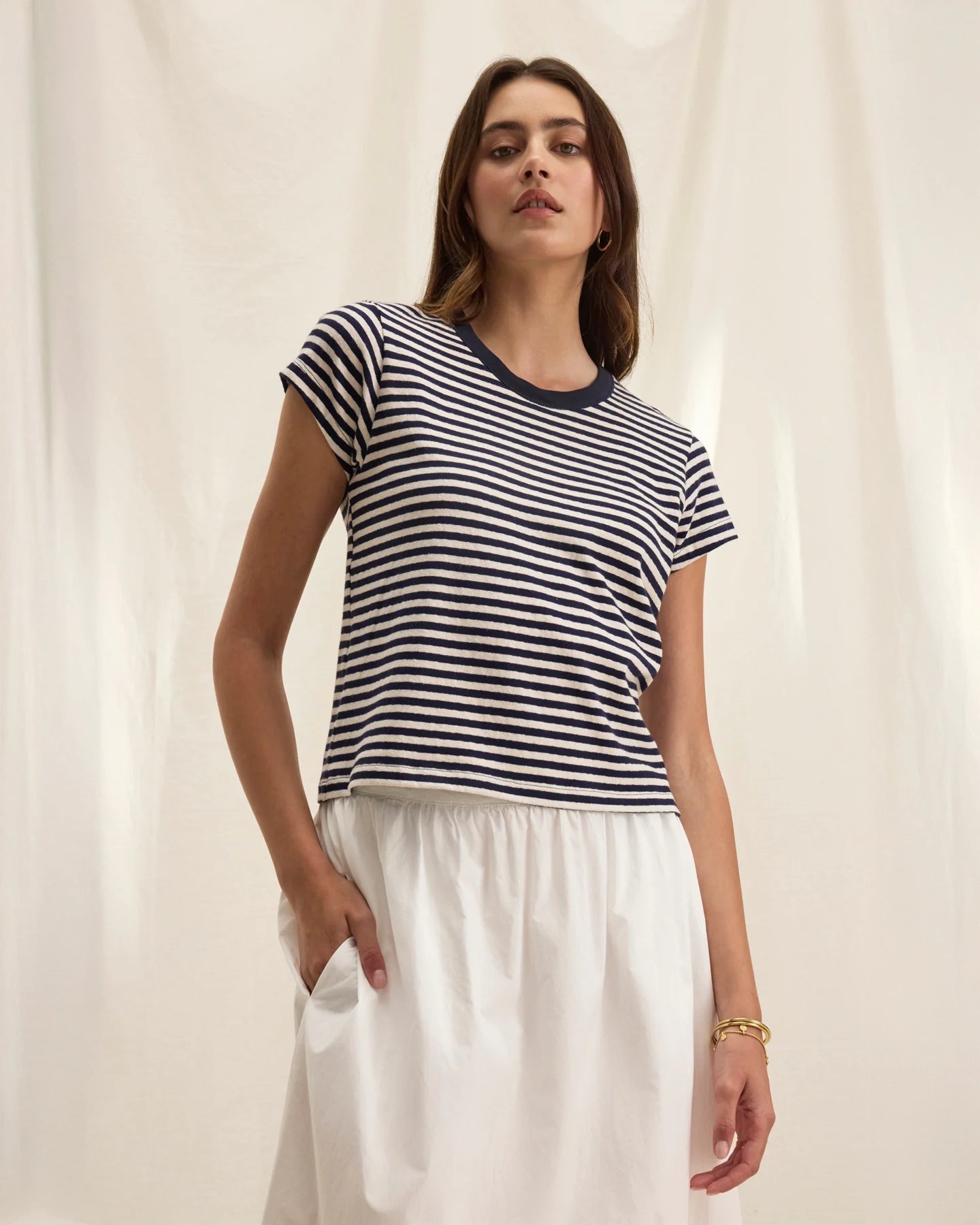 Made from striped cotton jersey with a hint of stretch, this tee features a classic crew neckline and short sleeves. The boxy, slightly cropped fit adds a laid-back, versatile silhouette.