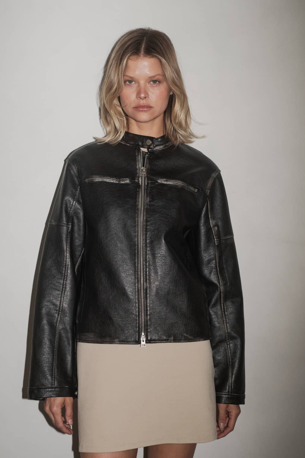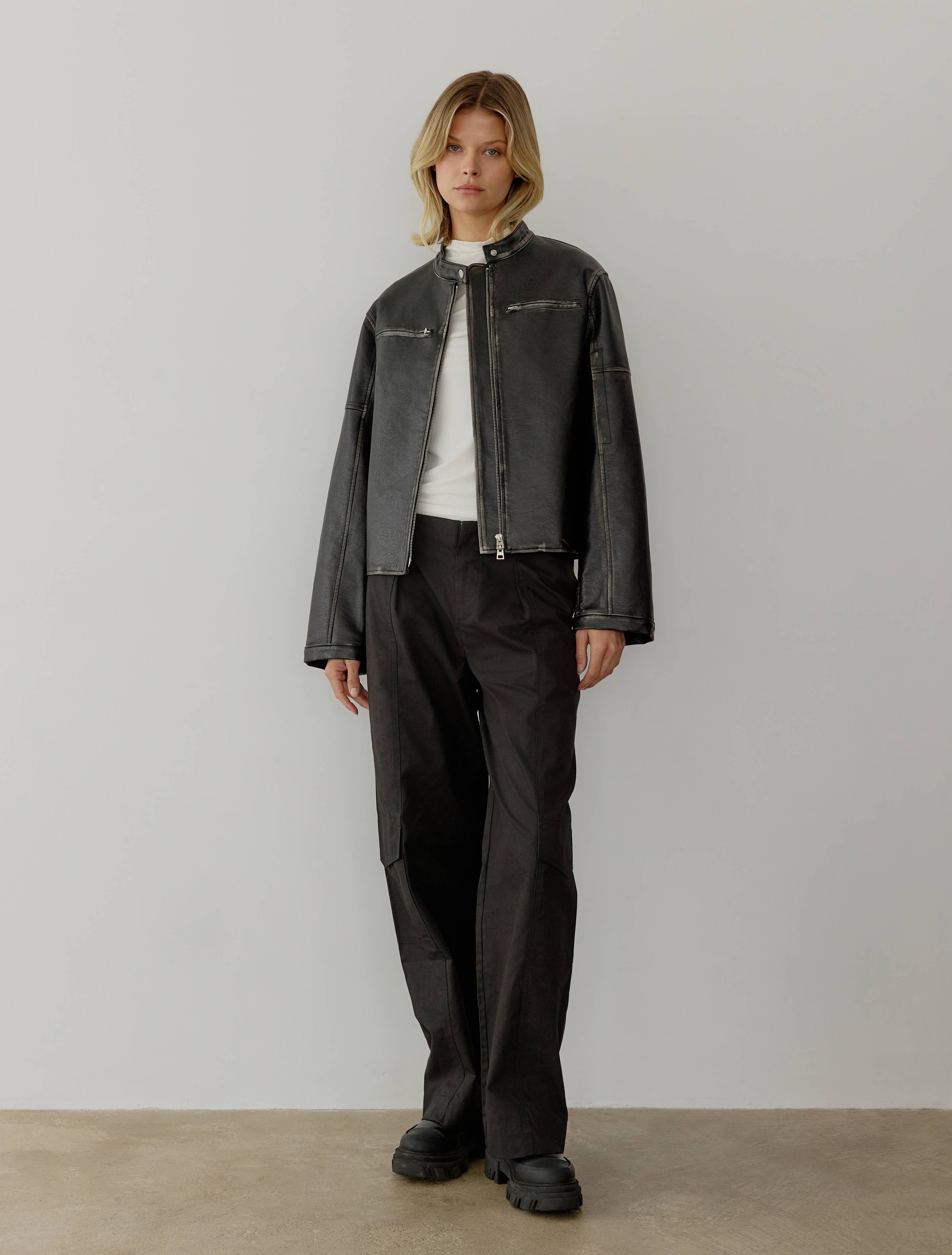 The Aether Jacket is a relaxed-fit faux moto jacket featuring a semi-cropped silhouette, five pockets, and an inner lining. Distressed seam details add an edgy touch, making it a stylish and functional choice for any wardrobe.