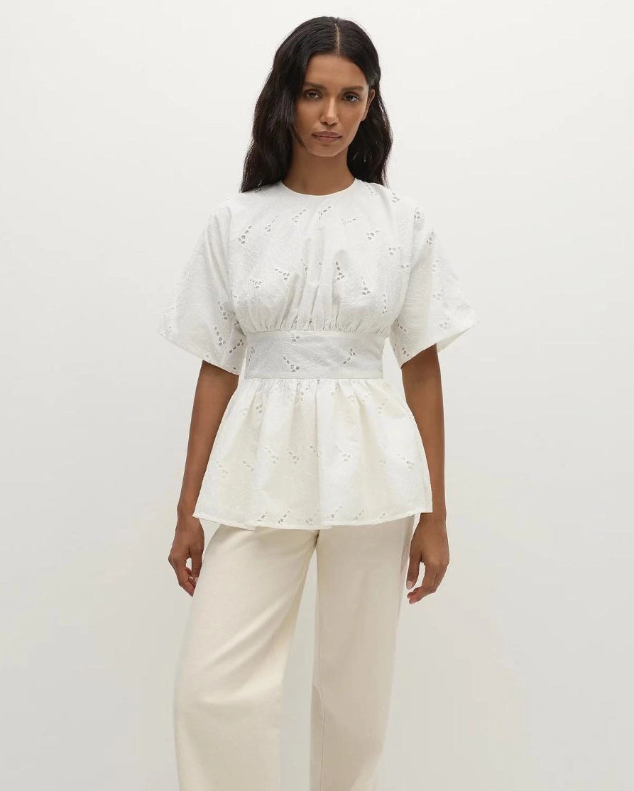 A feminine-inspired top with wide flared sleeves that finish around the elbow. It has a high rounded neckline with a belt band at the waist for a more flattering fit. Open at the back there are two bow details – at the back neck and back waist. From the waist it flares into an A-line hem that styles perfectly over your FAITHFULL denim. Offered in 100% cotton in a new white anglaise broderie.