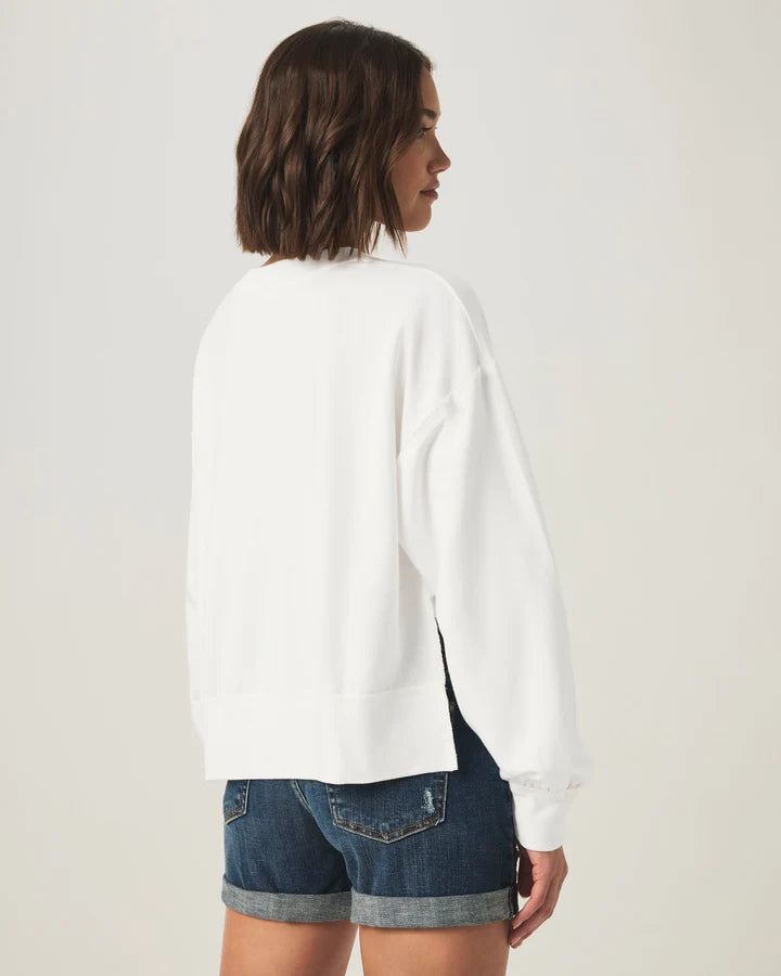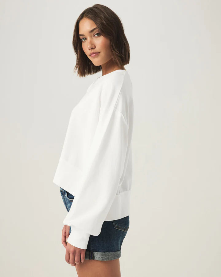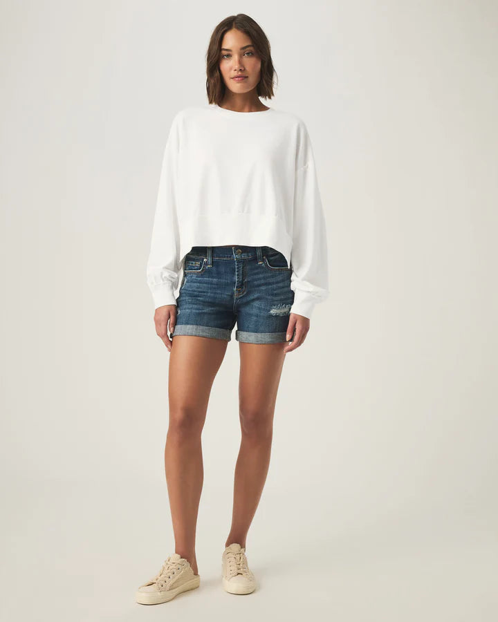 Made with a unique bleached indigo washed terry, the Hayden Terry Pullover Sweatshirt will stand out in your sweater stack. The boxy, drop-shoulder fit offers a relaxed fit while raw edge details on the sleeves and center back add an edgy touch. Slightly cropped with side slits, it pairs perfectly with high-waisted bottoms.