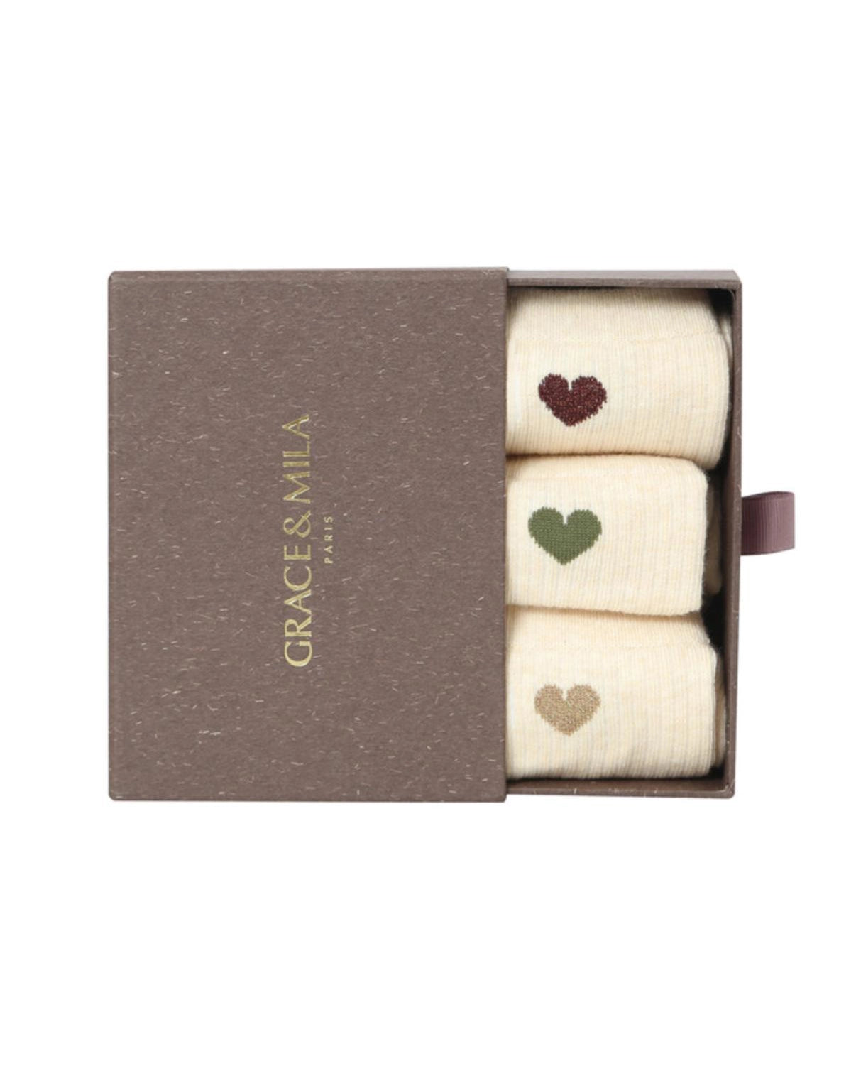 The SATINE mid-calf socks are made from an ecru ribbed knit and decorated with a colored lurex heart. The SATINE knit socks are carefully packaged in an elegant and minimalist box. They complete the Grace & Mila accessories collection.