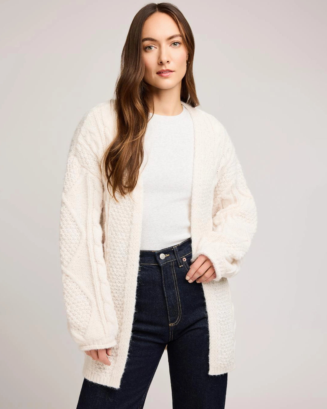 The Betty cardigan is made of a fuzzy yarn with a lofty feel. Features include various cable knit stitch patterns and a rolled sleeve hem detail.