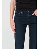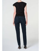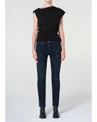The Cocktail Ankle Jean is a slim, ankle-length pant in dark, almost black indigo denim. Crafted from comfort-stretch regenerative cotton with a super-soft hand, it offers a sleek, true-to-size silhouette. Subtle marbling adds character, making it perfect for pairing with fitted tops or layering under oversized knits for a modern, versatile look.