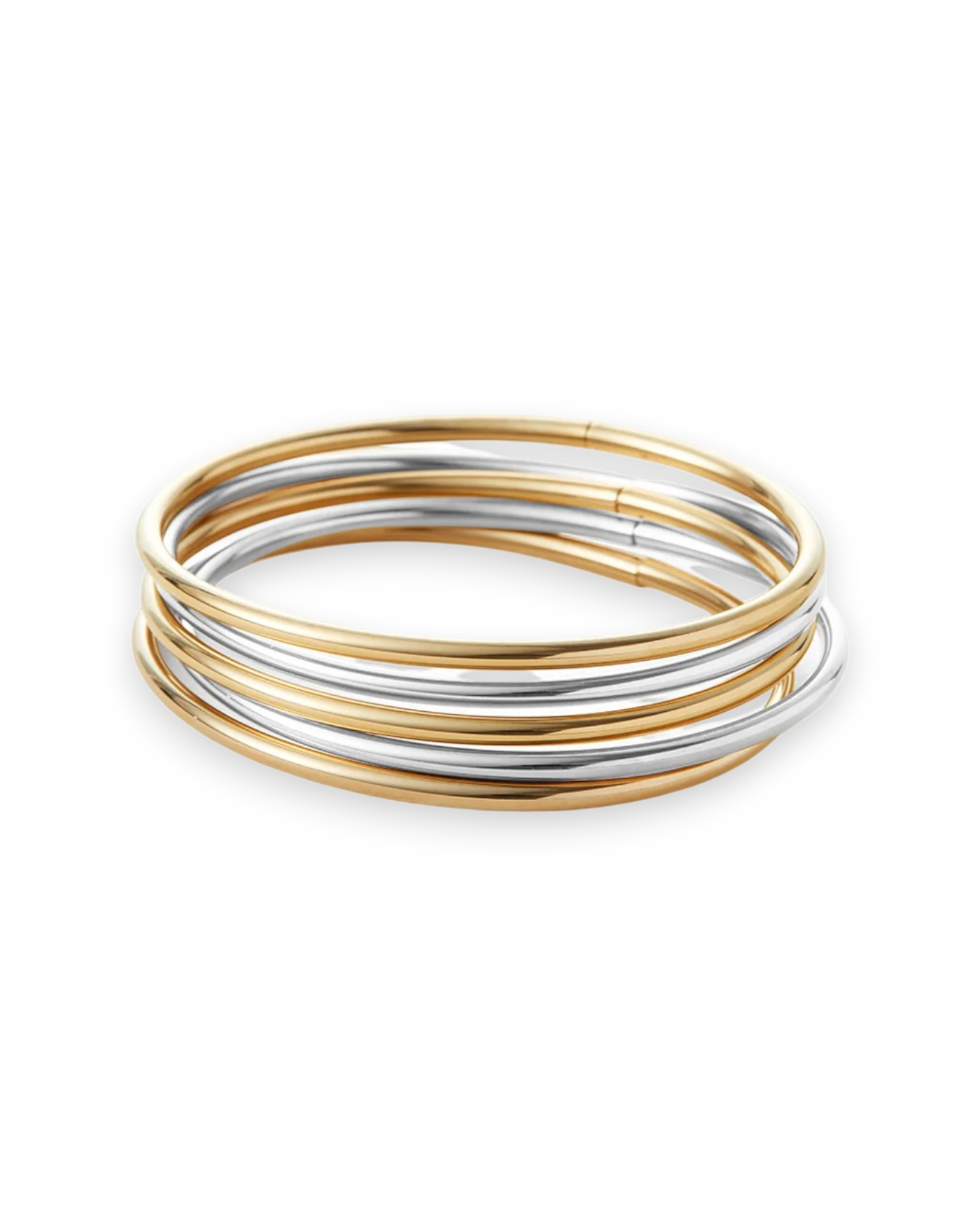 This water-durable design brings major impact to your stacking game with zero weight. Dane is super easy to put on and remove. To open, gently pull apart the bangle at the seam, rotating the tubes in opposite directions. Close by rotating back to the seam, and inserting the smaller tube into the opening. As this stainless steel is a very durable material, it can withstand some water exposure. The perfect piece to wear if you don’t intend to take it off. The circumference measurement of the bangles are 6 1/2" and 7 3/8", so make sure to add a little extra space for comfort of movement. One bangle is finished in high-polish silver, and the other is finished in high-polish gold.