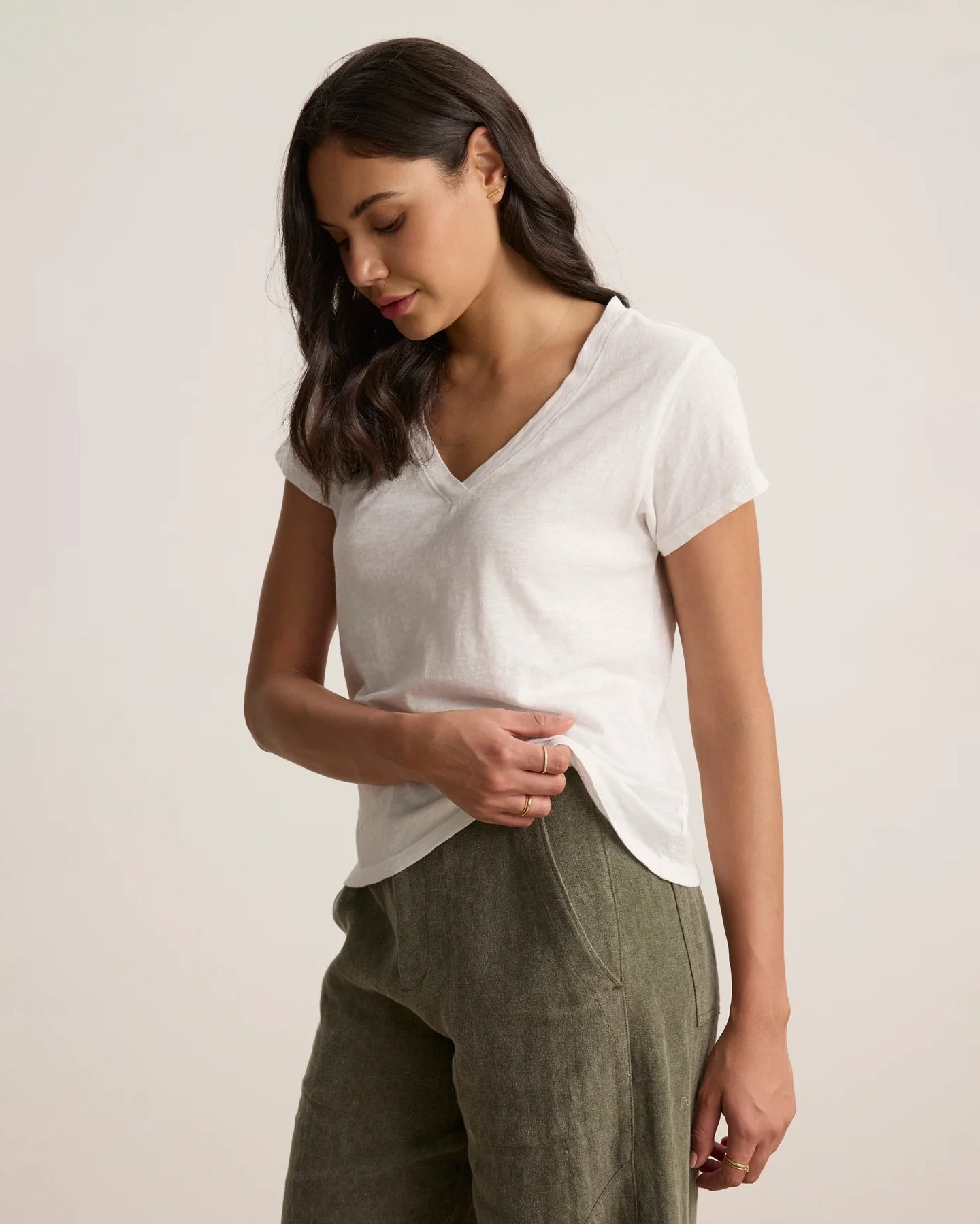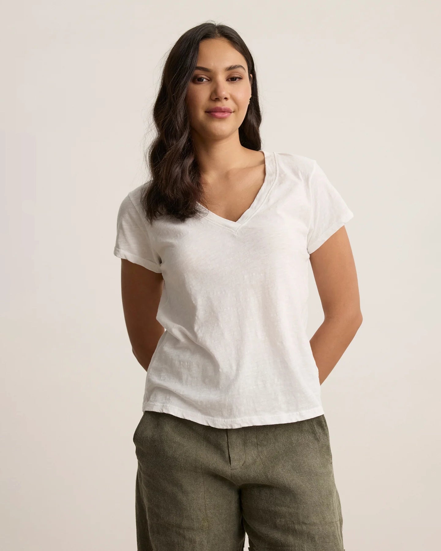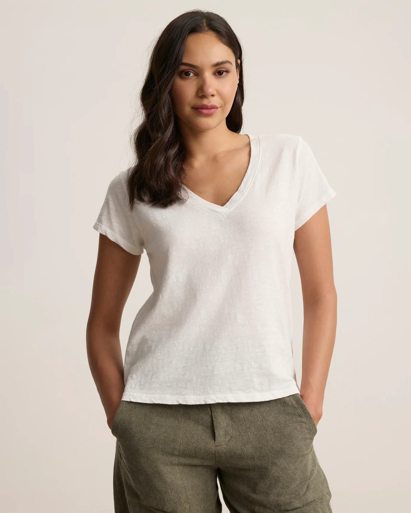 Expertly crafted with our original cotton slub, this tee offers a textured and soft feel, perfect for everyday wear. Its v-neckline and short sleeves provide a relaxed fit, making it light-weight and comfortable.