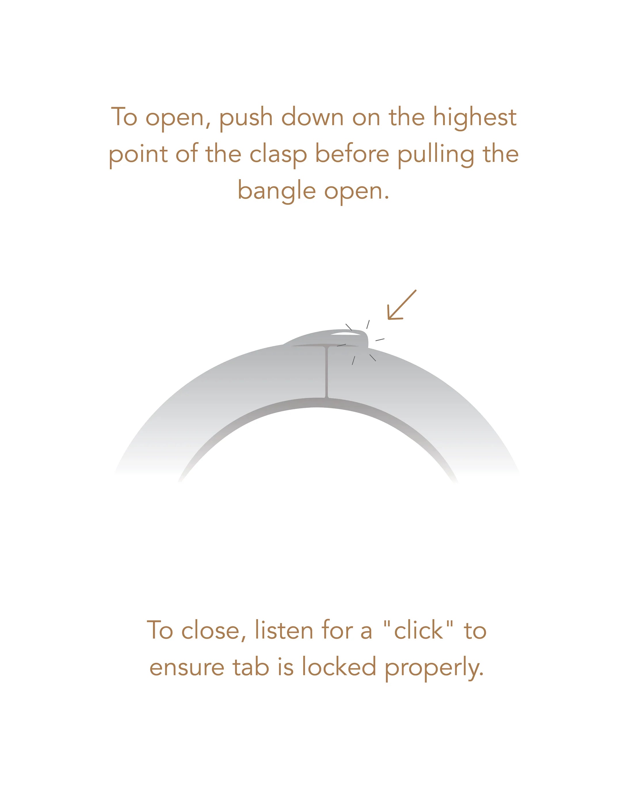 This custom bangle opens and closes with a hinge and tab lock closure. To open, push down on the highest point of the clasp before pulling the bangle open. To close, listen for a "click" to ensure tab is locked properly. Note: this design wears best when the closure is secured on the inside of your wrist, and the updated water-durable steel ensures the design stays put. Finished in high-polish silver