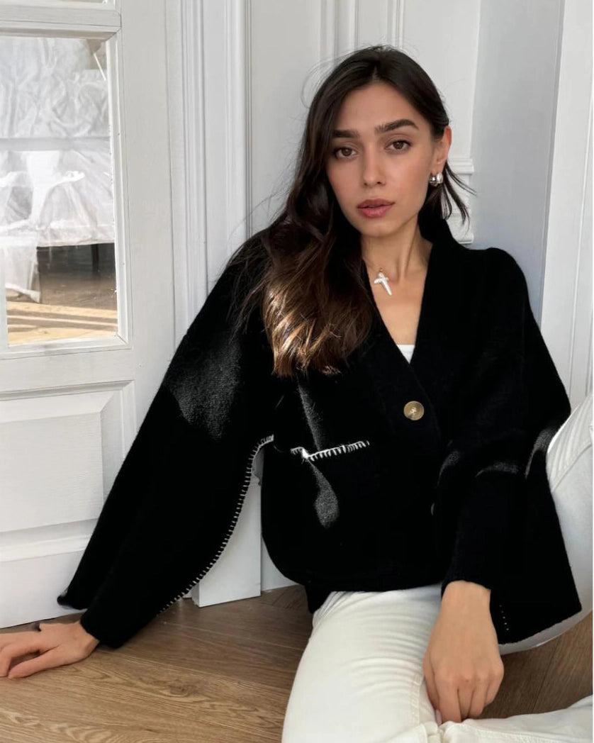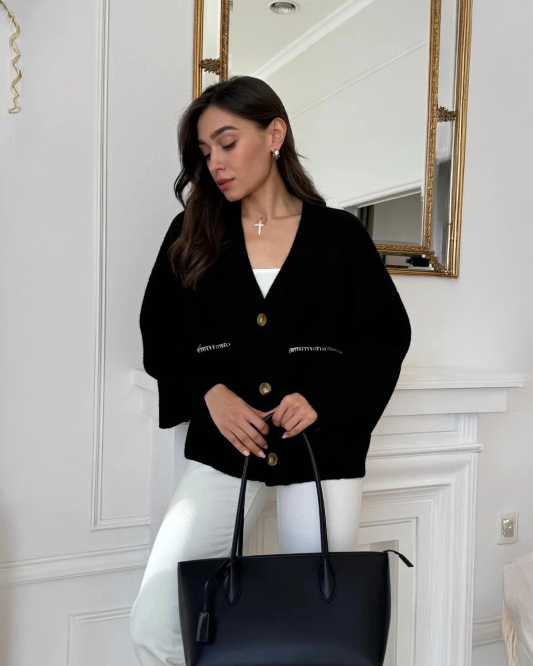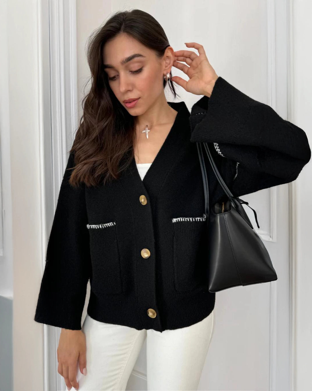 Kassie is an update on bestselling Cassandra cardigan. Elevated with an hand stitch detailing for a contemporary on-trend edge. Knitted with wider sleeves and a slightly cropped fit . Team with your favourite denim and a rollneck t-shirt for a polished look in cooler days. Endlessly versatile as a premium knit layer to simple minimal outfits this season