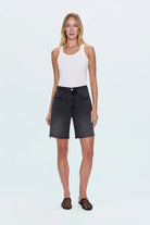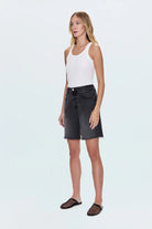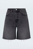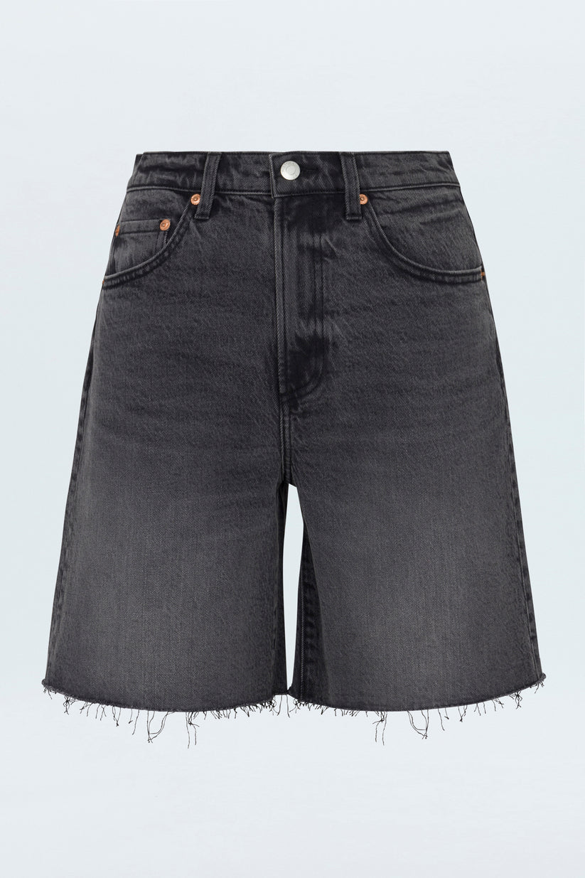 Now hitting cruising altitude. High rise, pinched waist short that falls into a long length, loose fit leg. Crafted from our signature comfort stretch denim for everyday wearability. After Hours is a washed black denim with vintage-inspired fading, light whiskering, and a frayed hem.