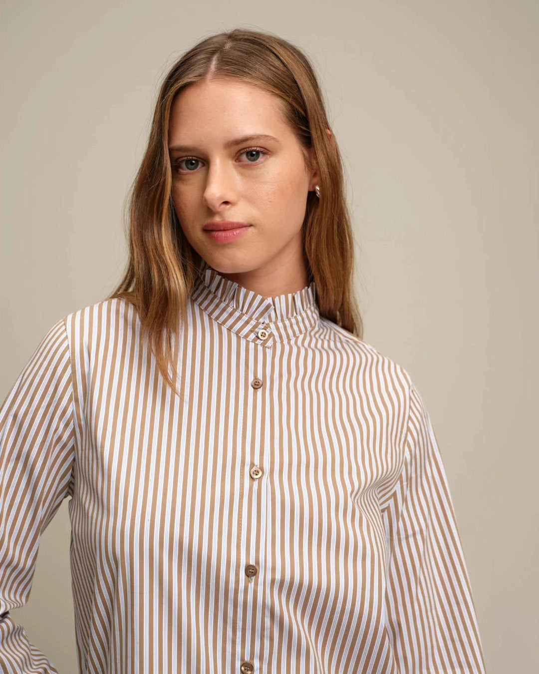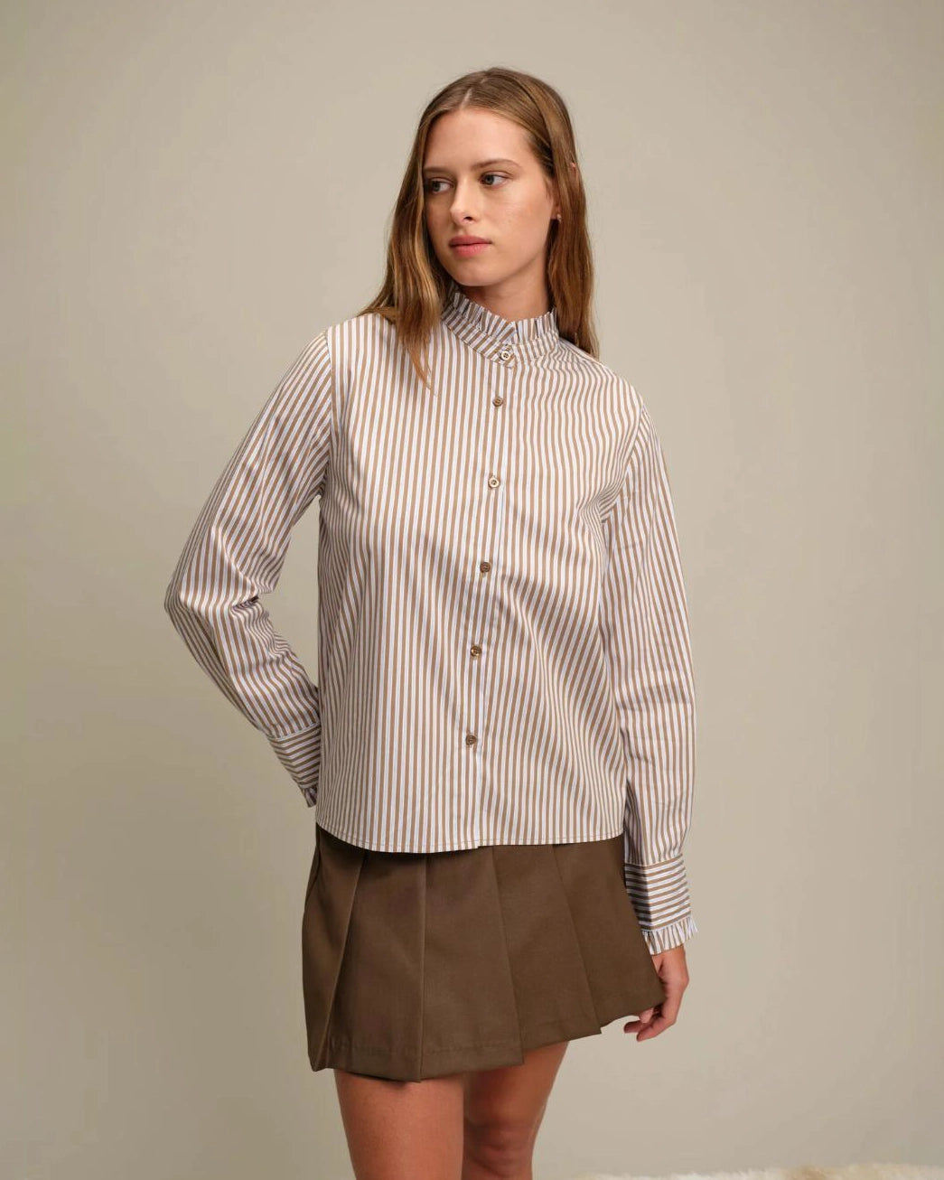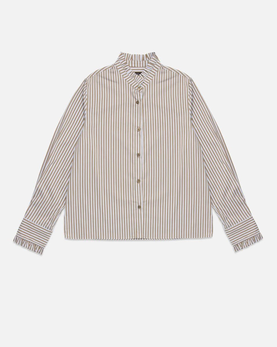 Poplin striped shirt with mao collar and long sleeves with buttoned cuffs. Ruffles on neckline and cuffs. Front button closure