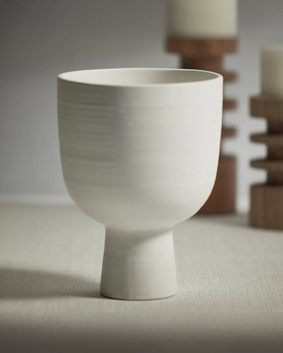This minimalist vase, available in two sizes, features a modern design with clean lines and a smooth matte finish. Its distinctive pedestal base adds height and elegance, making it perfect for displaying floral arrangements or as standalone sculptural accents.
