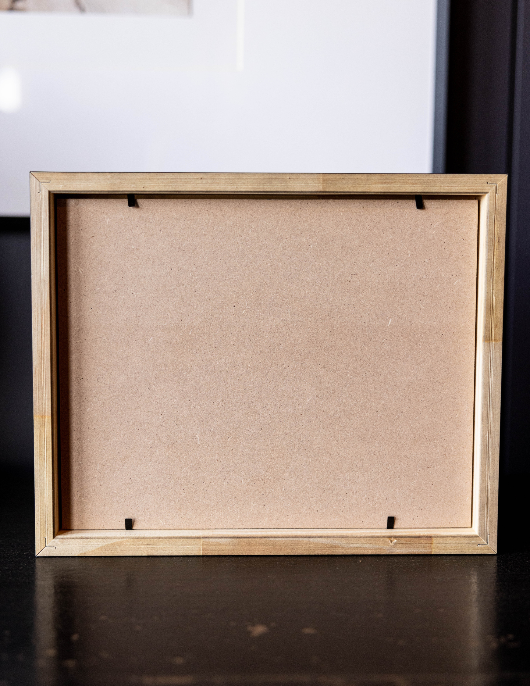 The back of the frame features a raised lip for easy hanging. For maximum impact, consider using an easel for display.